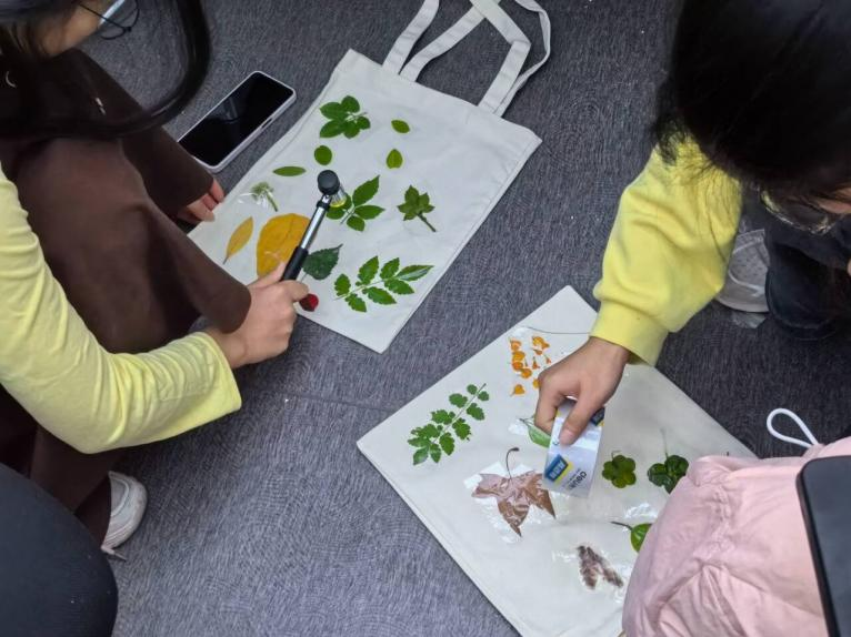 在下午树叶拓印的活动现场,工作人员精心准备了各类植物材料与制作工具,并详细讲解了植物拓印的基本原理及操作步骤。同学们发挥创意与动手能力,将采集来的新鲜叶片与花朵巧妙排列在布料上,用锤子耐心敲击,使植物的色素渗透布料,留下独特印记。每一次敲击都饱含对自然之美的热爱,将单调的布料装饰为植物艺术品,有的同学拓印出清新淡雅的花卉图案,有的则组合出充满意境的植物画卷。