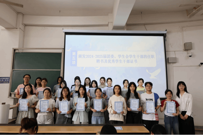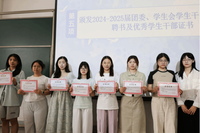会议第五项由倪晨昕为2024-2025届团委、学生会学生干部颁发任职聘书,并为“优秀学生干部”颁发证书。