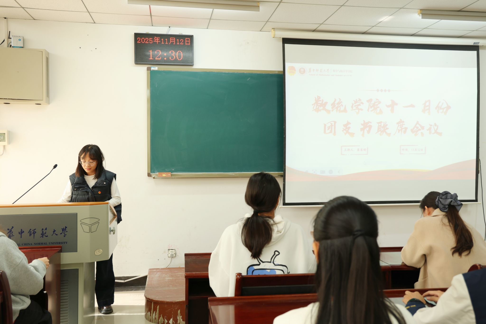 华大青年讯(通讯员 章钧淇 周钰露)为深入学习贯彻党的重要精神,明确团支部工作方向,11月12日,数学与统计学学院(以下简称“数统学院”)十一月份团支书联席会议于国际文化交流学院3号教学楼C508会议室召开。数统学院团委副书记(学生)李梦睿、团委青年志愿者协会负责人邓清秋出席会议,2024级、2025级全体团支部书记到场参会。会议由团委组织部学生助理(营员)蒋家晴主持。
