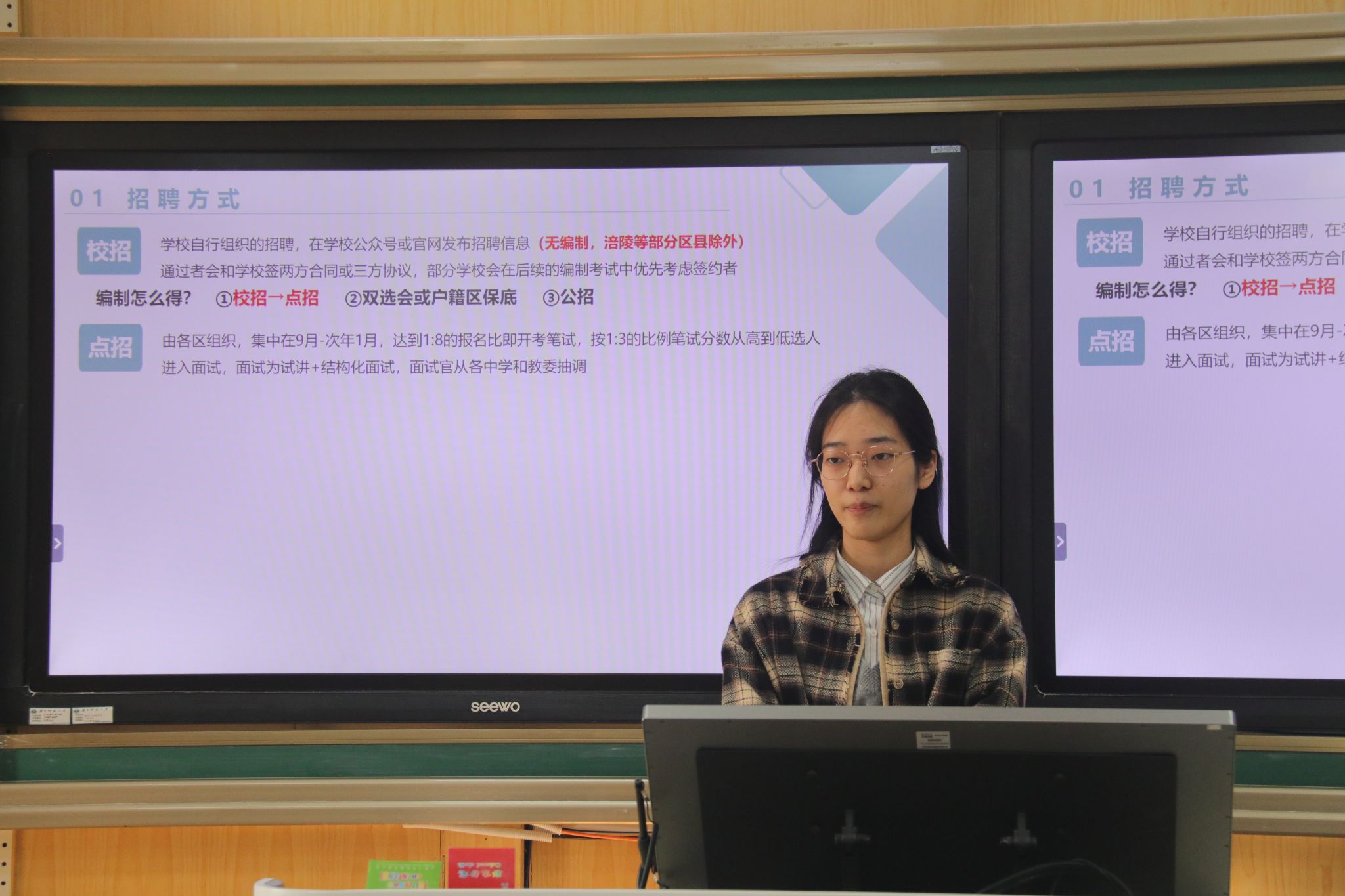 颜哲娴先从雅礼中学的实习情况出发分享经验:详解实习手册要点,分享高效听课方法;讲解教学与班主任工作参与技巧,强调要主动对接指导老师、争取机会,同步班主任作息并学习班级管理。随后她拆解湖南省及长沙市招聘流程,说明省属、市属、区属招聘的差异,点明多数市属校会组织提前小面,并细致讲解了长郡中学面试、雅礼中学小面。最后给出招聘准备建议:材料需突出学分绩、奖学金,简介排版要侧重教学背景、教育实践、获奖与科研经历。