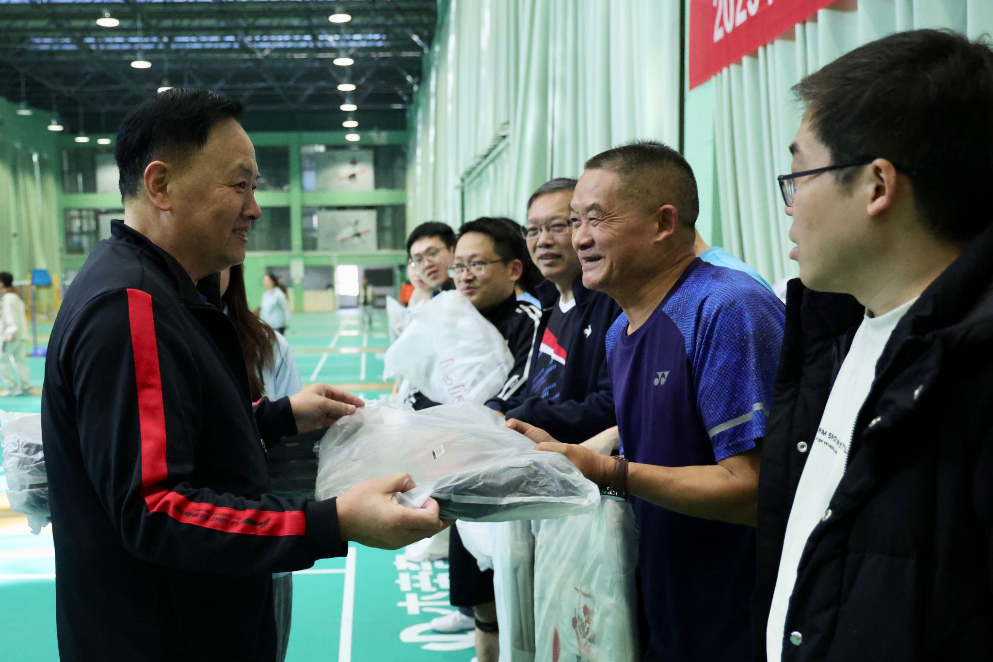 随后,数统学院与党政机关友谊赛精彩开赛。赛场上,网前控制与后场扣杀交替上演,攻防节奏紧凑激烈。各场地选手灵活调整跑位、变换击球路线,凭借精准落点与果断抉择形成多轮对抗,充分展现羽毛球运动竞技活力,传递拼搏奋进的体育精神,赢得现场喝彩。颁奖仪式上,彭双阶、周鹏程分别为获奖队伍颁发奖品。