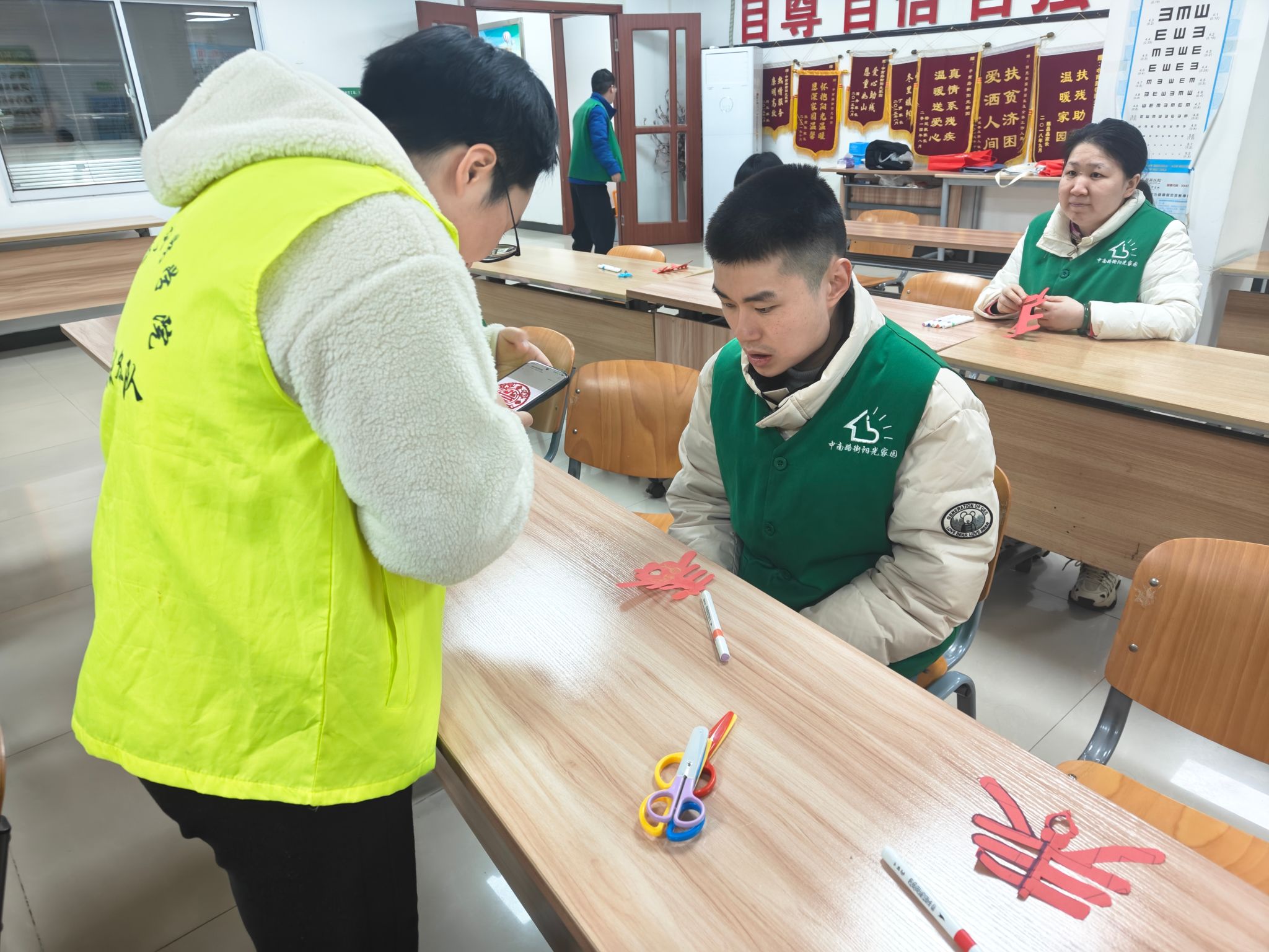 活动伊始,志愿者提前抵达活动场地,迅速投入到现场布置工作中,将剪窗花所需的红纸、剪刀、胶水等工具分类摆放、整齐归置,为活动的顺利开展做好充分准备。待残障朋友们到场后,志愿者主动上前迎接,热情引导大家有序就座,用亲切问候、温暖笑容拉近彼此距离,现场氛围温馨而融洽。