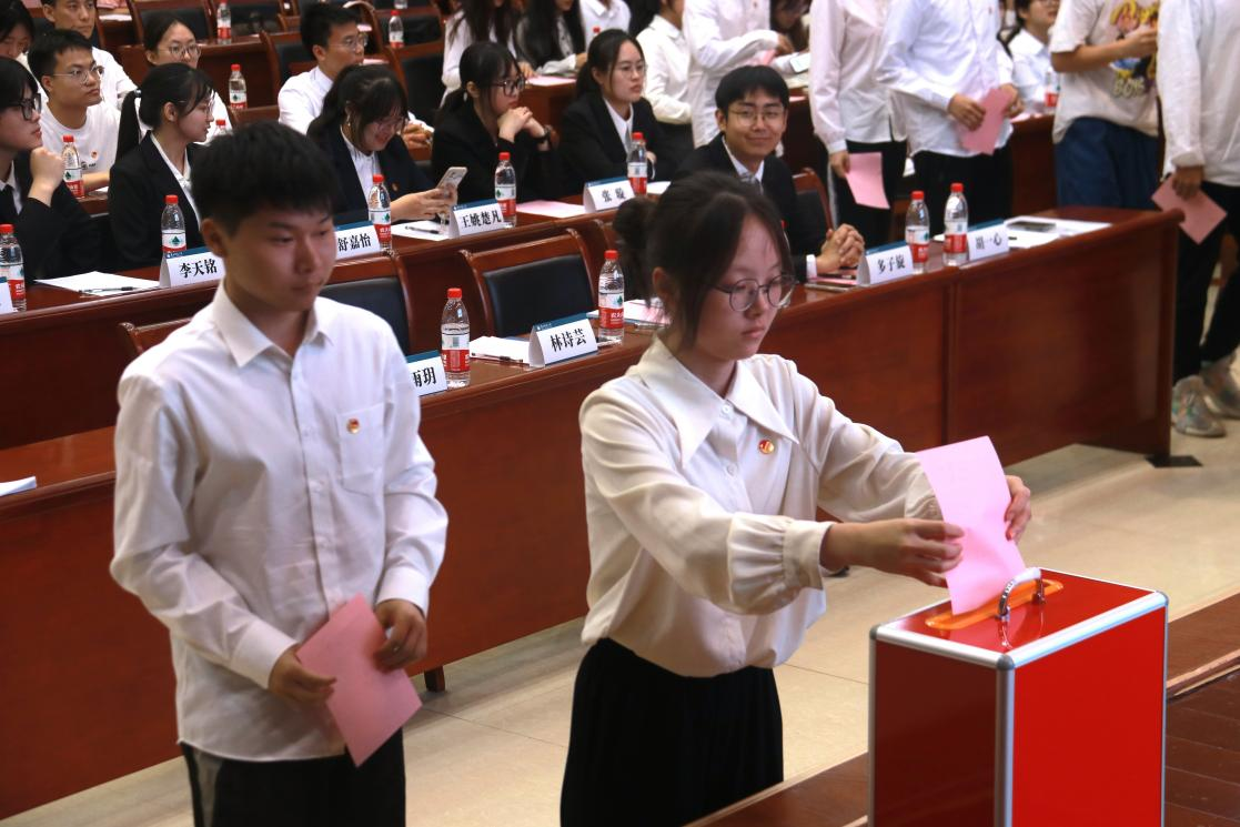 数统学院第二十三届学生会主席团4名候选人依次向大会作竞选演讲。候选人们回顾了过往的学生工作经历,阐述了个人的竞选优势,同时对院学生会的未来发展进行展望,充分展示了学生组织工作人员的工作能力与服务意识。在总监票人、监票人的监督下,参会代表以不记名方式逐一为候选人投票。经过计票人的统计,白芸、邓懿菲、郭天宇入选数统学院第二十三届学生会主席团。