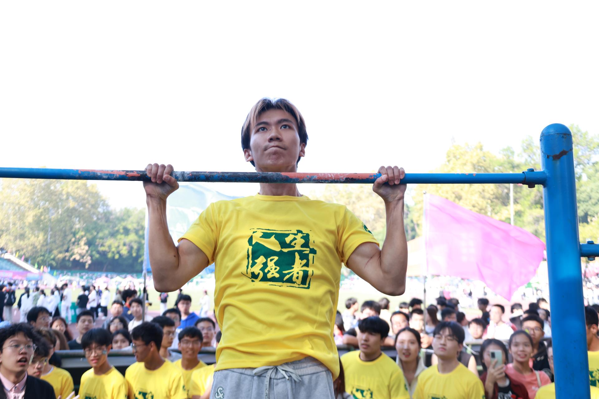 比赛开始前,运动员们在检录处有序排队进行热身,为即将展开的比赛做好充分准备。数统学院第一位参赛选手是韩有福,他一跃而上,牢牢抓住单杠,不断撑起落下,即使力竭也不曾放弃。袁嘉泽,明乐轩等选手紧随其后,相继取得骄人成绩。运动员们团结一致,顽强拼搏,用最后的力量完成一个个动作。他们坚韧不拔,互相鼓舞,自强不息的精神振奋着每一个人,信念与力量跃动在赛场上。最终在三十名同学的共同努力下,数统学院完成共计620个引体向上的优异成绩。