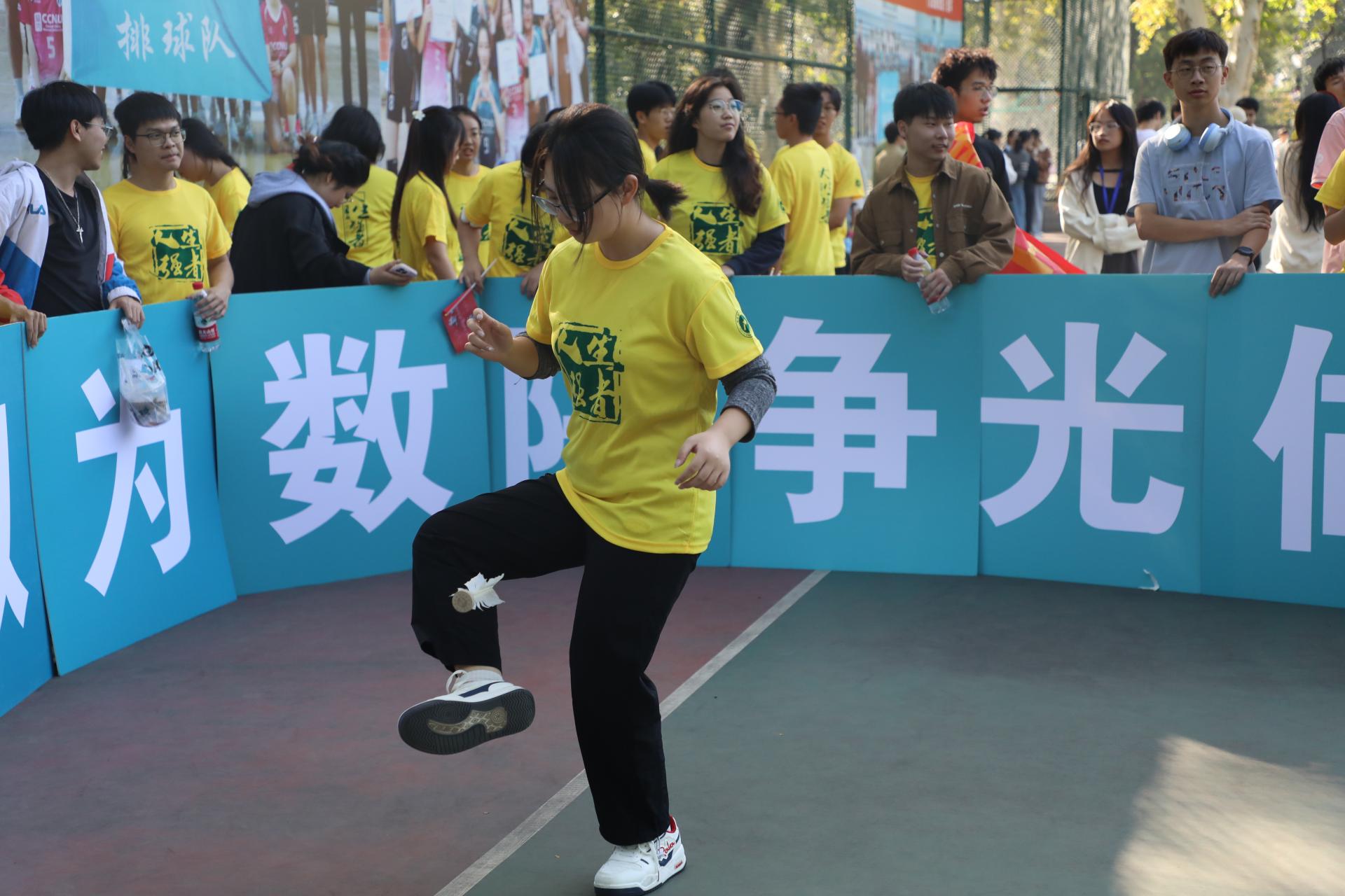 比赛正式开始,数统学院的运动员们有条不紊地将手中的毽球抛出,再用脚稳稳接住。在他们的控制之下,白色的毽球在空中飞舞。他们的技术十分娴熟,这是大家刻苦训练数十天的成果。随着时间推移,比赛渐入高潮。激烈角逐下,每位运动员虽高度紧张,却未影响发挥。他们沉着冷静,偶有失误也不慌乱,都能迅速调整,找回节奏,继续踢毽球。