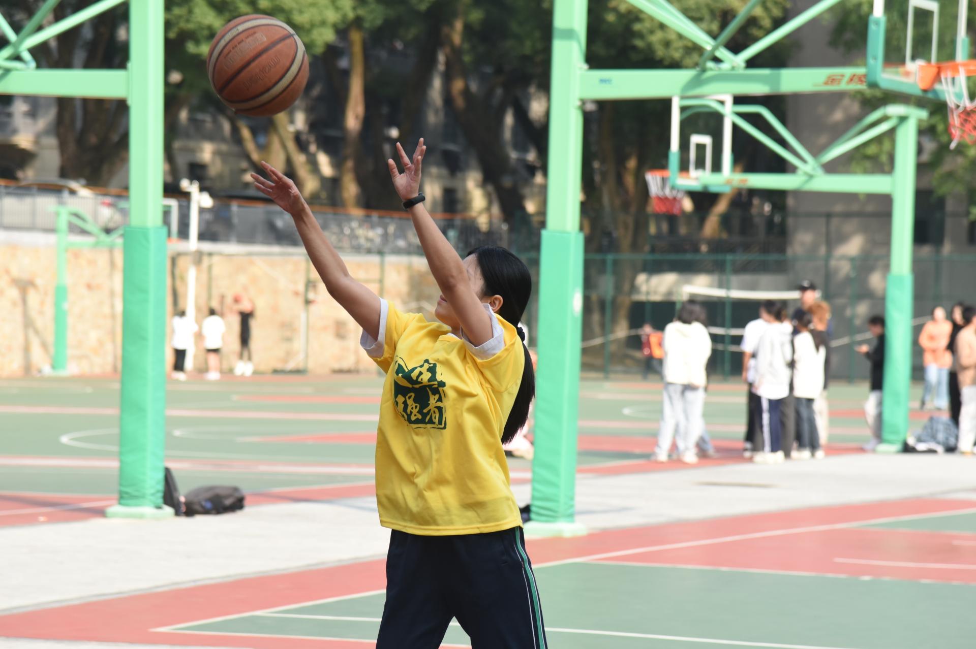 随着一声哨响,定点投篮比赛正式开始。选手们迅速进入状态,全神贯注地投入到比赛中。他们站在投篮点,眼神坚定地盯着篮筐,屈膝、抬臂、抖腕,动作娴熟。篮球在空中划出一道道优美的弧线,精准地落入篮筐。现场气氛热烈,数统学院的助威团们挥舞着旗帜,为选手们加油助威,呐喊声与篮球入筐的声音交织在一起,在篮球场上回响。