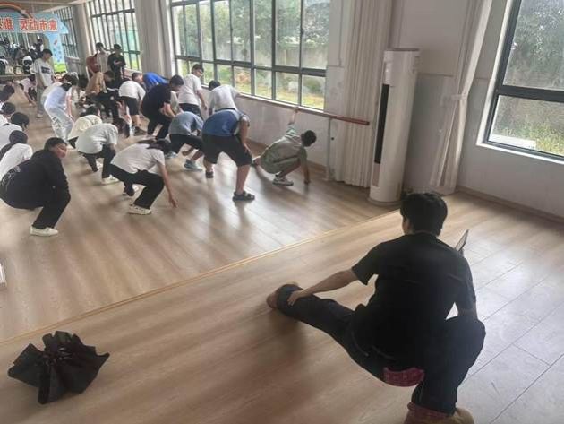 舞蹈课由队员蒋白金负责,他将流行街舞进行改编,通过讲解示范完整舞蹈动作,让学生对舞蹈动作有初步的认知,随后将动作进行分解教学,突出动作细节要领,帮助学生逐步掌握舞蹈动作,在一次次重复中感受流行街舞的魅力。