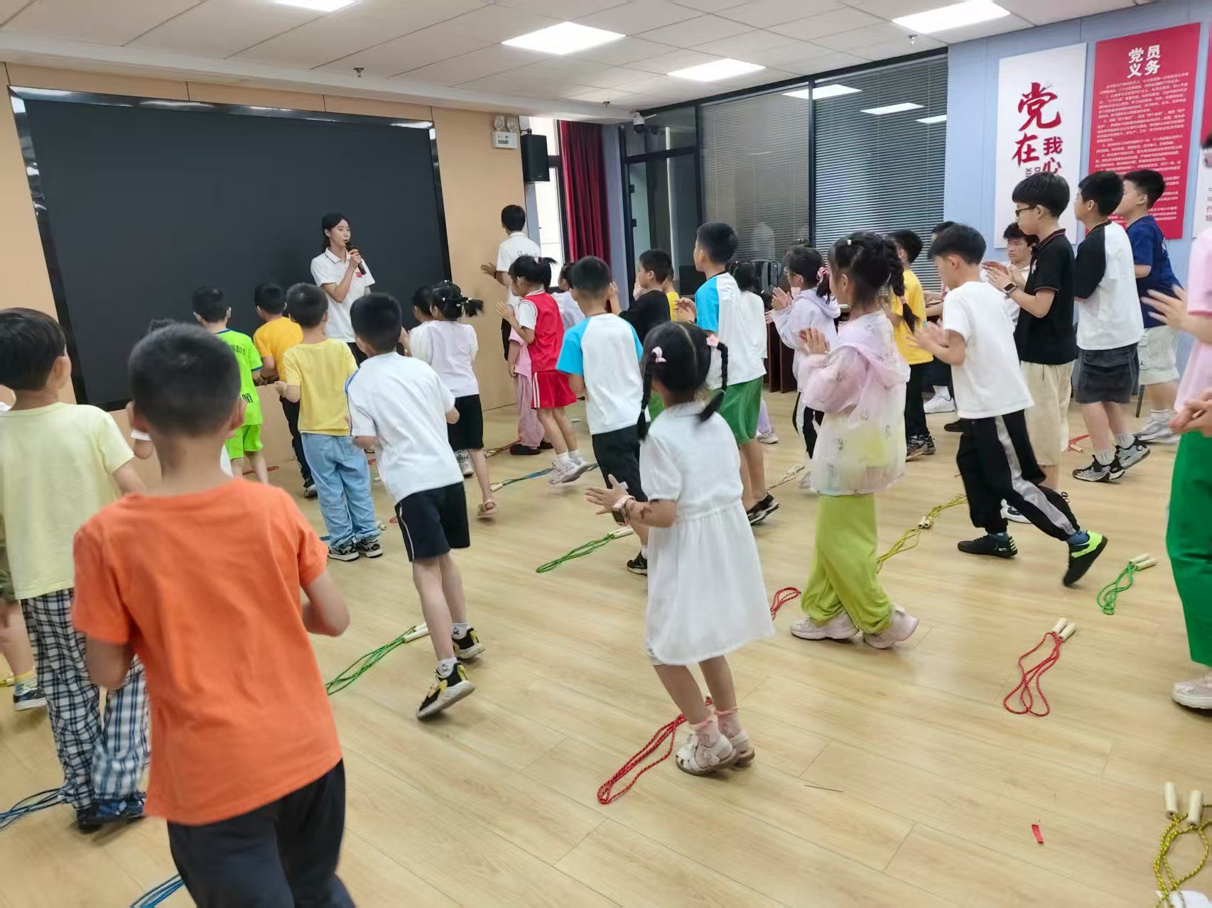 7 月 15 日,绳操课堂迎来巩固与提升。志愿者先带领孩子们复习前四节操,熟悉的口令响起,孩子们手持彩绳整齐划一,动作较首周已显娴熟。随后的新动作教学中,丘老师着重强调 “手臂摆动与脚步移动的韵律感”,亲自示范如何让绳子的弧线与身体的转动形成呼应。有孩子因绳子打结略显急躁,志愿者蹲下身帮他解开绳结:“慢慢来,你看绳子在等你呢。” 在耐心引导下,孩子们渐入佳境,彩绳在他们手中时而如银蛇绕腕,时而如彩虹架肩,展现出中期学习的扎实成果。