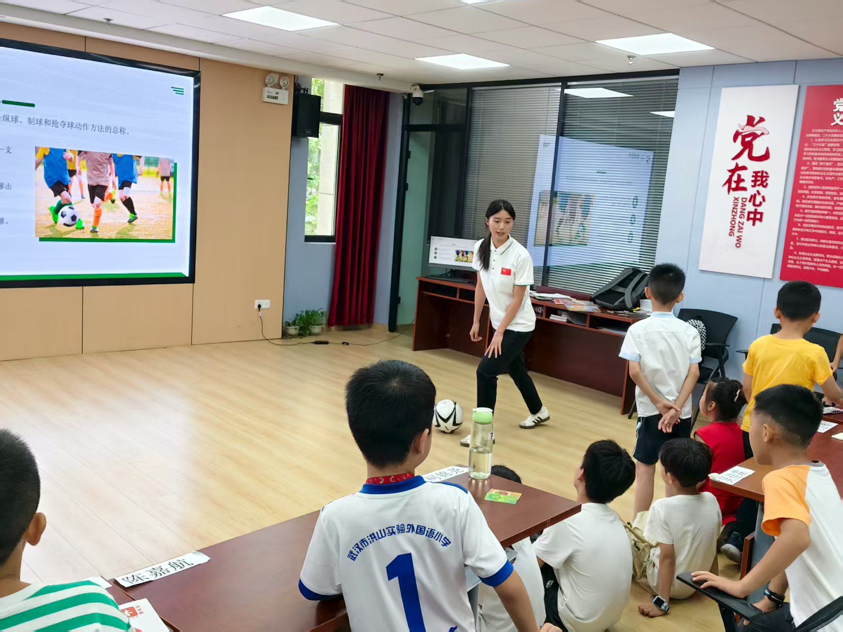 7 月 14 日,足球的魅力席卷托管班。志愿者化身 “足球讲解员”,从古代蹴鞠的雏形讲到现代世界杯的盛况,用生动的故事串联起足球的发展脉络。“看,这个黑白相间的球体,用 12 块五边形和 20 块六边形就能拼出完美球面哦!” 志愿者用专业的语言和标准的姿势讲解踢球要领,孩子们围靠在一起认真思考。阳光洒在绿茵场上,足球滚动的轨迹里,藏着孩子们对这项运动的好奇与向往。