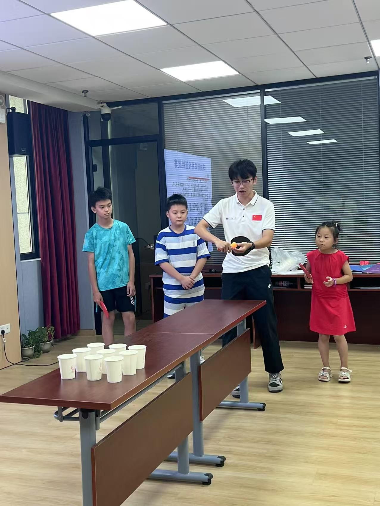 7 月 16 日,乒乓球与趣味投篮的组合带来别样欢乐。乒乓科普课上,志愿者展示直拍与横拍的握法差异,用 “小球跳桌” 的比喻讲解发球技巧,孩子们好奇地挥动迷你球拍模仿。而“纸杯投篮挑战赛” 更添热闹,孩子们站在不同距离投掷小球。孩子们积极参与,现场热烈。