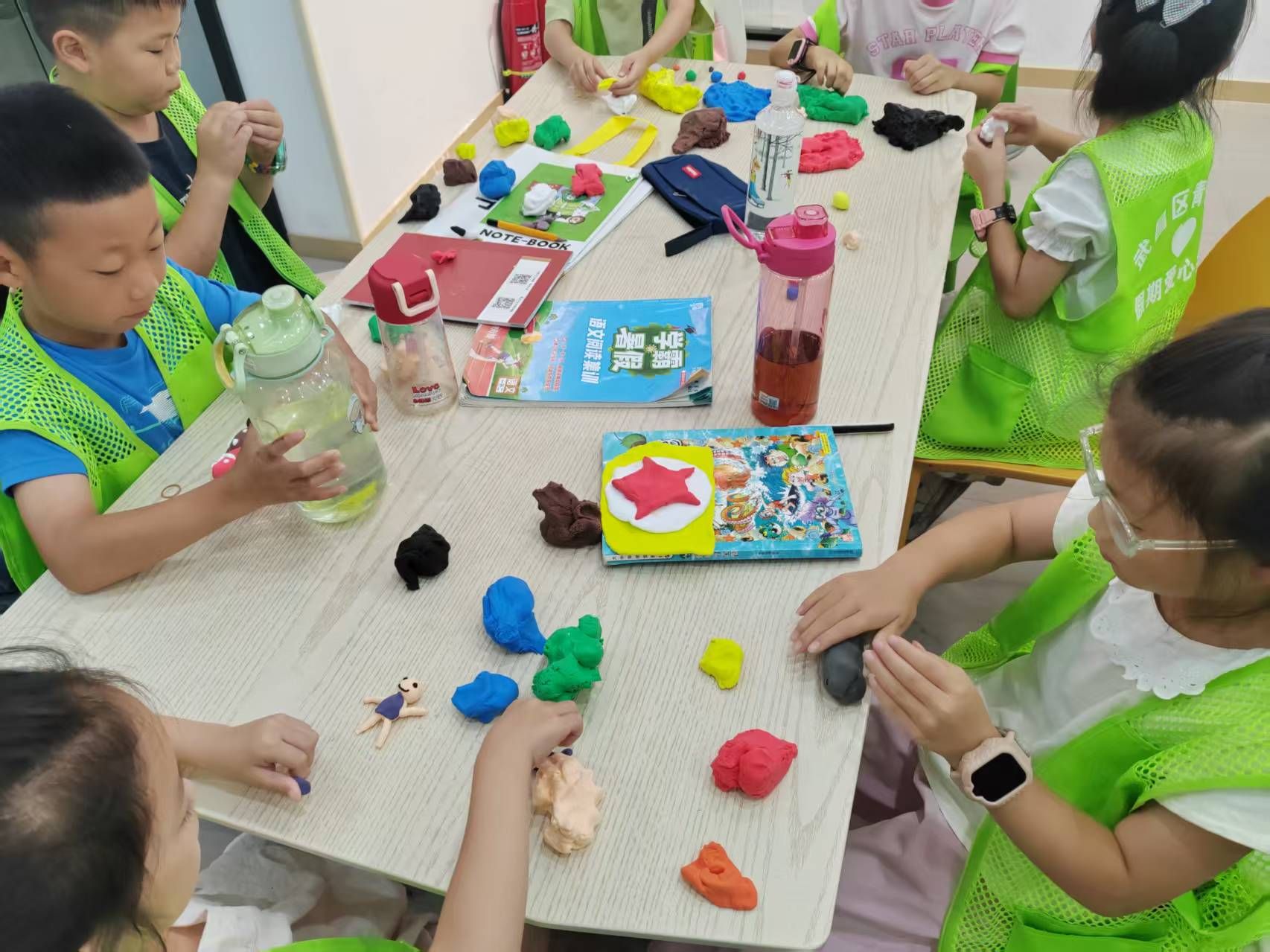 理论知识讲解告一段落,孩子们期待已久的实践环节随即开启。志愿者们带着五颜六色的手泥,和小朋友们一起用指尖创意践行环保理念。“小朋友们,我们的小手能变出神奇的宝贝哦!”活动一开始,志愿者就拿起手泥示范起来。在志愿者的引导下,孩子们兴致勃勃地揉着、捏着。有的把红色手泥捏成圆圆的有害垃圾桶,上面还认真地画上“×”;有的用蓝色手泥做了可回收物垃圾桶,旁边配上小小的“循环箭头”图案;还有的捏出了一棵棵绿芽、一朵朵小花,说是要“种”在自己的画里。