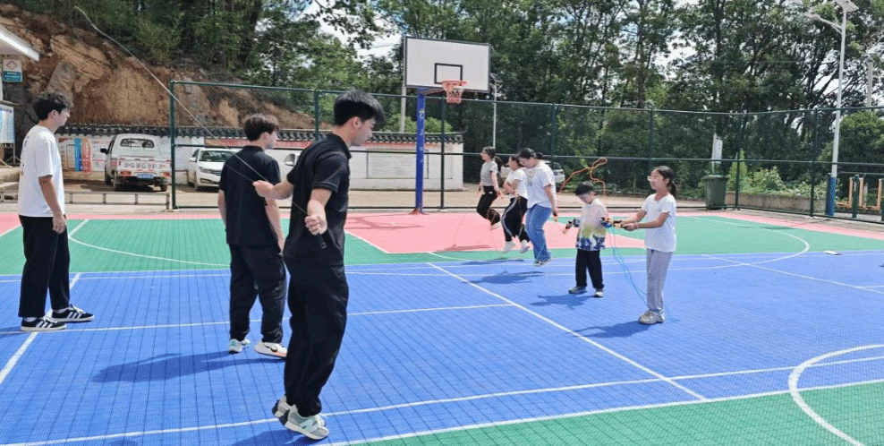 7月24日上午,太阳高高升起,学生们在队员们的带领下来到楼下的小篮球场上,队长王翦早已备好教案,和队员们一起悉心教导孩子们怎么调节跳绳长度,在队员们的指导下,孩子们掌握了并步跳、左右雪橇跳、高抬腿跳等全新的的动作,“原来跳绳有这么多花样!”孩子们发出赞叹的声音。孩子们通过跳绳收获成就感的同时,了解到山村外世界的广阔,也正是体育实践,让孩子们对未来的发展,有了更多的期待。队员们也相信,只要用心备课,简单的课程也会有更深层的意义。