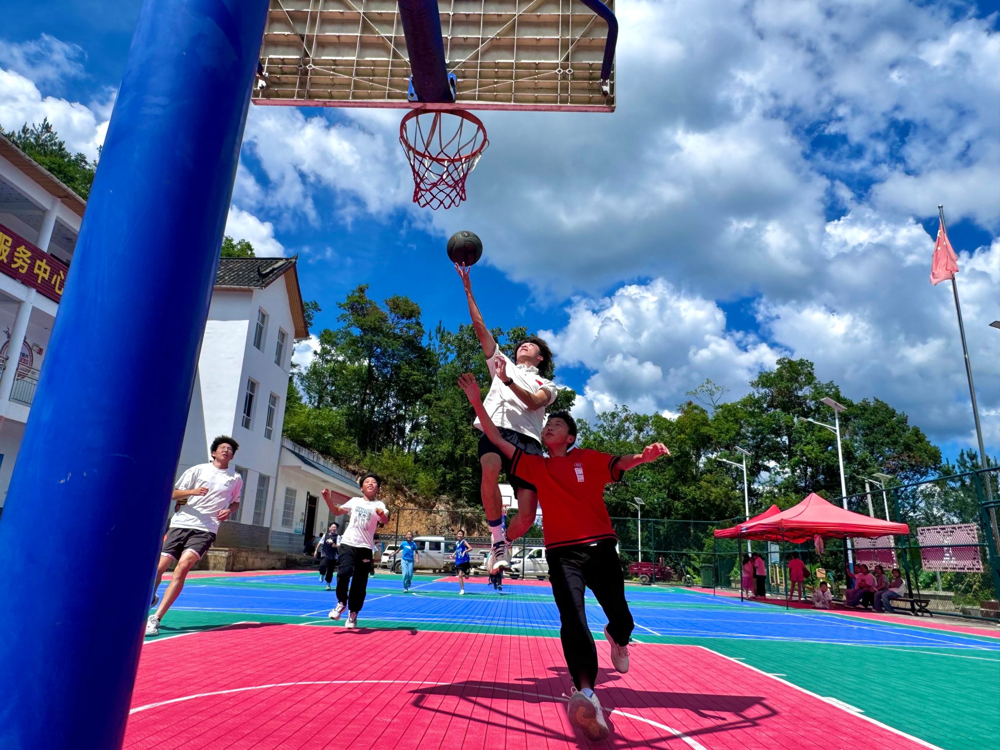 午休过后,柏杨坪村委会的篮球场上,一场特殊的篮球比赛点燃了山间的午后。球场中间的两支队伍已经准备展开较量,随着队长王翦的的一声令下,“老师队”和“学生队”便展开了激情的较量,平日里天真的孩子们,此刻目光坚定,势必拿下这场比赛,这正是敢于拼搏,争创佳绩的体育精神的体现。