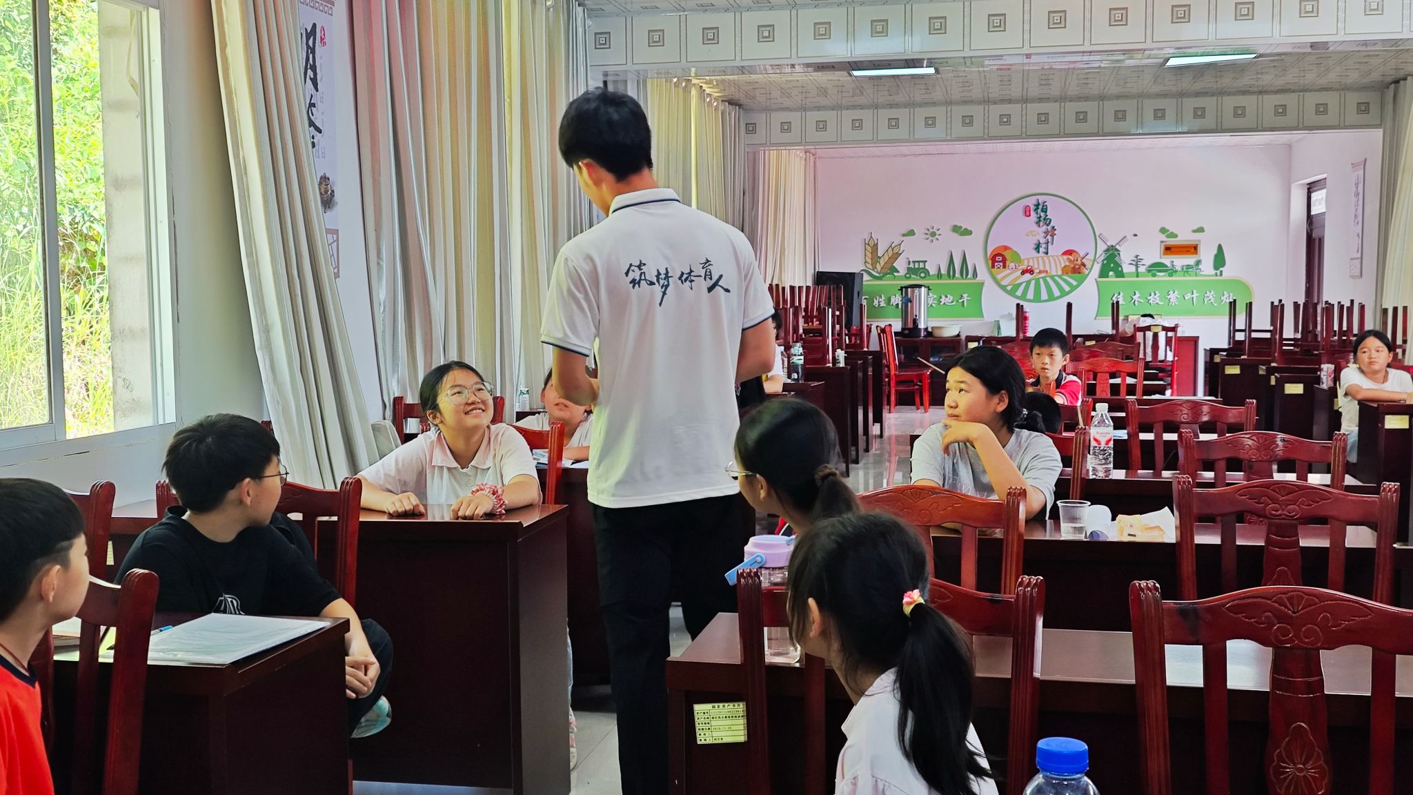“灯火里的中国,青春婀娜;灯火里的中国,胸怀辽阔……”教室里,20余名孩子在王翦的带领下,齐声唱响《灯火里的中国》。窗外是连绵青山,窗内是孩子们眼中的光,与歌词里的“灯火”交相辉映。这堂特殊的音乐课是“乡音传情”,也是此次支教珍贵的一部分,实践队成员们运用歌声的旋律来表达对祖国的热爱,让孩子们从歌声中感受时代的发展,那些对祖国未来的憧憬也正随着歌声在孩子们的心中慢慢生长。那些回荡在山谷里的旋律,正像点点灯火,照亮着孩子们对家国的懵懂认知。