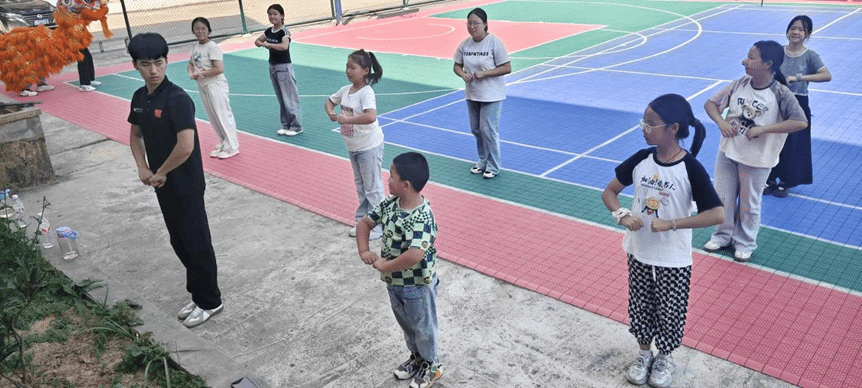 在进行素质教育的同时,技能培训也十分重要。7月28日,为了几日后的展演,实践队员们更加精心设计教学课程,针对低年级同学身体特点和健美操的难度特点,队员们选择将小学低年级同学抽出,单独安排节目,小学高年级同学则参与较复杂的健美操节目。在7月29日与7月30日,上午,队长王翦和队员陈庚带领队员在村委会楼下练习健美操,学员们用专注的眼神和挺起的胸膛来全力做好每个动作。在下午,学员们在队员王淞和队员李恩祺的带领下操练初级长拳第三路套路,队长和队员们躬身力行,在实践中传授孩子们“忠诚博雅,朴实刚毅”的精神,为孩子们的成长提供榜样。