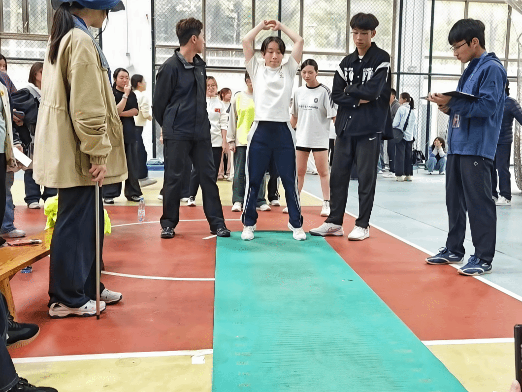 随之而来的是女子立定跳远比赛。室内的温暖混着轻声鼓舞,同学们围着一圈引颈期盼,攒着劲儿向前探望。运动员们带着自信的微笑,从容不迫,目视前方。踮脚、上摆手,下蹲、手摆回,起跳!一气呵成,步步到位,有破竹之势,似离弦之箭。强壮的力量与坚定的信念,生动体现了外院学子的运动精神。
