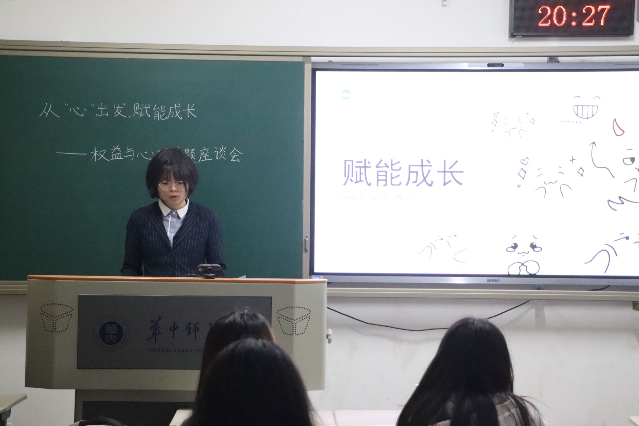 会议伊始,郭诗曼首先反馈了通过前期调研工作获得的相关数据与结果,并梳理和总结了当前学生在心理权益方面的实际需求。随后,她介绍和分享了沟通技巧、“五感接地法”等实用心理调节工具和方法,有效帮助参会人员掌握基础疏导方法和应对措施。此外,会议还组织全体人员开展“烦恼便利贴”集体活动,通过便利贴这一载体诉说内心的故事,让大家在倾诉与交流中共同成长。