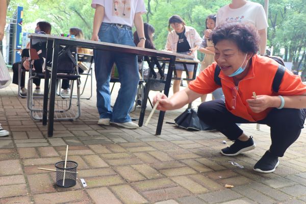 在第一个项目“雅歌投壶”中,每位玩家共有五支“箭”,可进行五次投壶。在90秒内的投壶成功次数即为可获得的印章数目。在笔筒制成的“壶”面前,同学们纷纷弯腰、瞄准、投掷,沉心静气,全神贯注。第二个项目“端午夹粽”则考验了同学们的耐心程度及手指的灵敏度。有的同学胆大心细,手中的竹筷不断夹取用彩色丝线制成的“小粽子”,引得围观的同学阵阵欢呼。