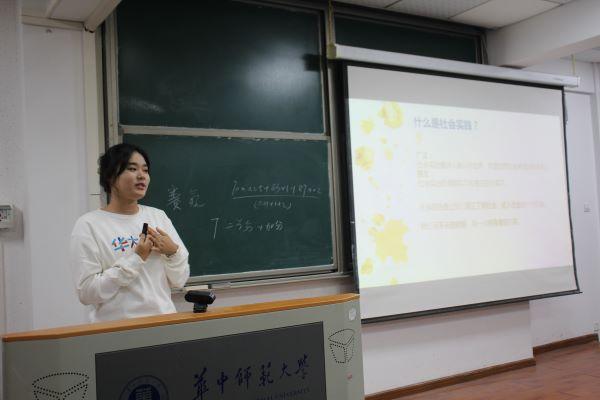 在贺泽芊的社会实践经验分享环节,她精简地介绍了自己的经历之后,从两个方面展开分享:一是如何参与社会实践,她认为就应该将兴趣发挥到极致:从爱好出发,在社会实践中找到自己的定位。二是社会实践的意义,她提到“社会实践就是我们用不长的时间,做一件终身难忘的事”。在分享过程中,她从个人与集体两个层面,向新生们娓娓道来青禾实践队和恽代英青年班与乡野的故事。通过对一张张实践记录图片的生动叙述,她向在座每一位听众阐释了自己对于“一种情怀、一份感动、一次回忆、一个自己”的具体感悟。