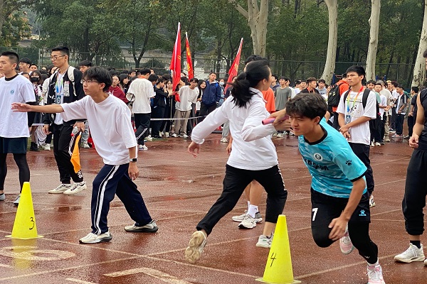 作为第一个团体组项目,50米迎面接力赛一开始就吸引了在场同学的目光。比赛开始前,运动员们有条不紊地做着准备运动,调整比赛状态。22级运动员胡毅在第一组一道率先冲锋,他弯腰俯身、全身紧绷,一声令下,如在弦之箭全力冲向终点。随后,22级运动员杨晨接力冲刺,他们脚步飞扬、踔厉奋发,展现了外院学子的风采精神。随后接力棒来到女运动员王心怡手中,她巾帼不让须眉,在观众的声声欢呼呐喊下加速奔跑。最后一棒由李炜坤接过,他心无旁骛,眼里只有终点,在热血沸腾的欢呼声中完成接力。经过激烈的角逐,外院50米迎面接力最终取得小组第一名、学生组第六名的优异成绩。