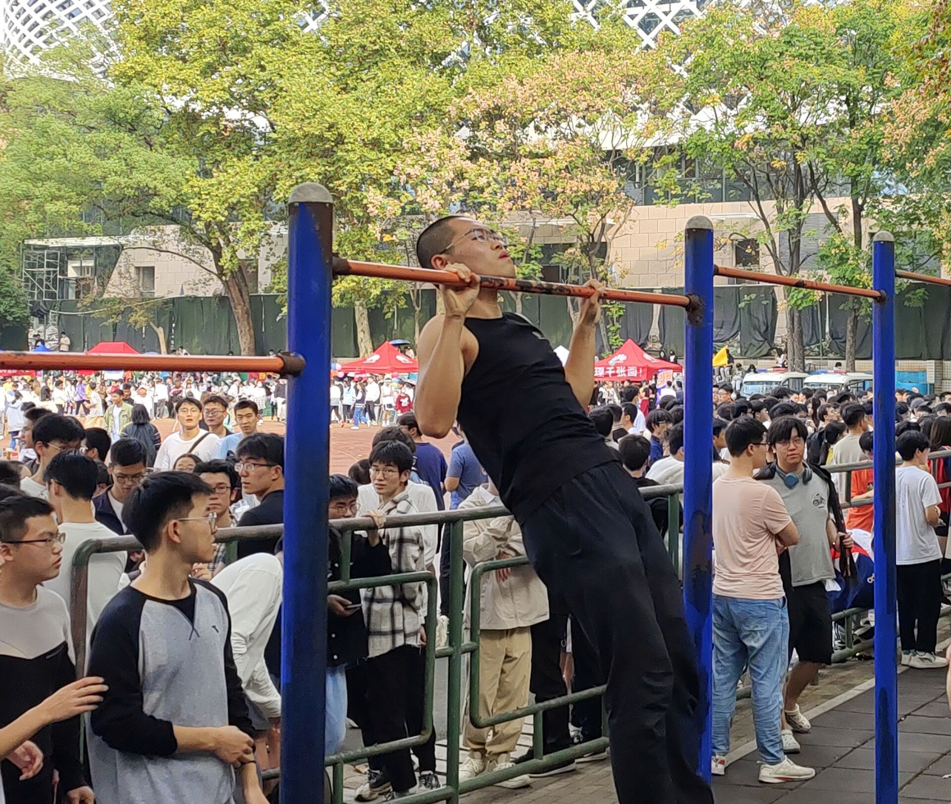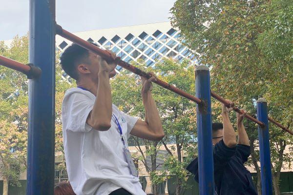 在11日下午举办的男子引体向上团体比赛中,外院男子组的选手们也勇于突破自我。30名运动健儿接力向上,双手握臂,志在为外院争光。第一位上场的是21级的运动员刘帅,他在规定时间内完成了22个引体向上,为外院赢得先机。在同伴们的不断鼓舞下,外院健儿们一气呵成,上下的举臂节奏一致。在观众的欢呼声中,比赛进入了白热化阶段,队伍之间的差距越拉越大。尽管如此,落后的队伍也并没有放弃,全力诠释“永不言弃”的体育竞技精神。