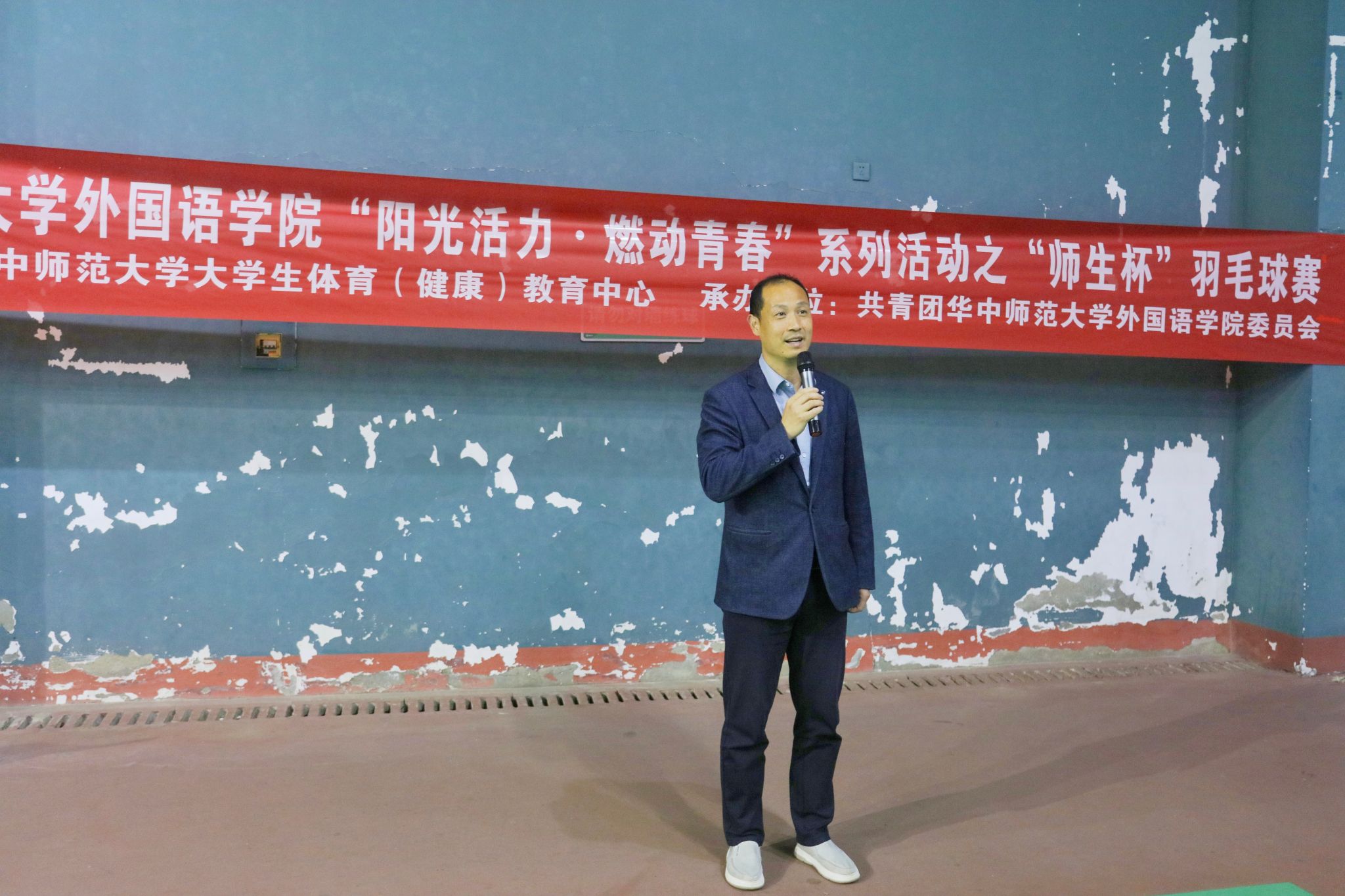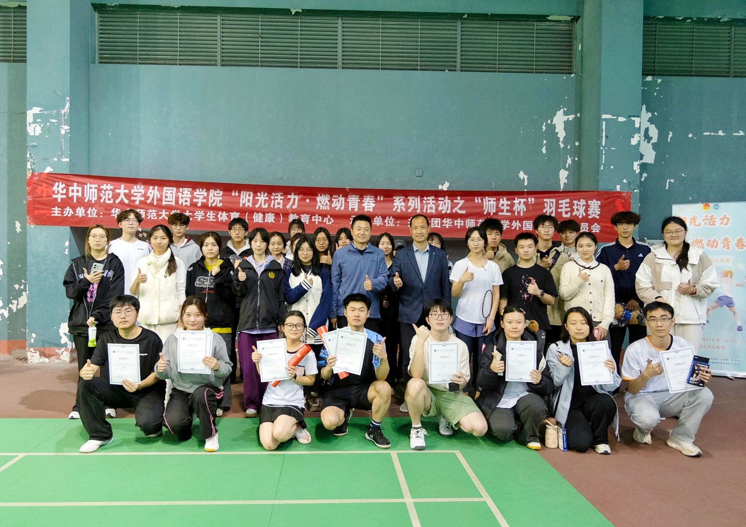 华大青年讯(通讯员 陈媛 王思涵 迪丽努尔)3月27日,外国语学院(以下简称“外院”)于东区乒羽中心举办“阳光活力·燃动青春”系列活动之“师生杯”羽毛球赛。本次比赛由华中师范大学大学生体育(健康)教育中心主办,共青团华中师范大学外国语学院委员会承办。外院党委副书记罗舰、团委书记吴波及全体师生选手参加开幕式。外院学生会文体中心成员马茗芷担任主持。