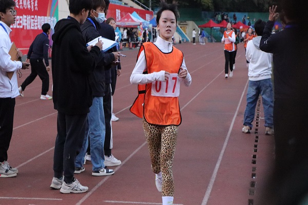 赛前,选手们在志愿者的带领下完成检录,换上马甲,走上跑道。运动员张钰涵在采访中表示:“这时候我有些紧张,但不论成绩如何,我都希望自己能坚持到底。”比赛尚未开始,操场上就传来志愿者们摇旗呐喊,加油助威的声音。站在赛道上,运动员们目视前方,蓄势待发。发令枪响,二十几名选手如离弦之箭从起点出发。伴着欢呼声,她们步履坚定,勇往直前。