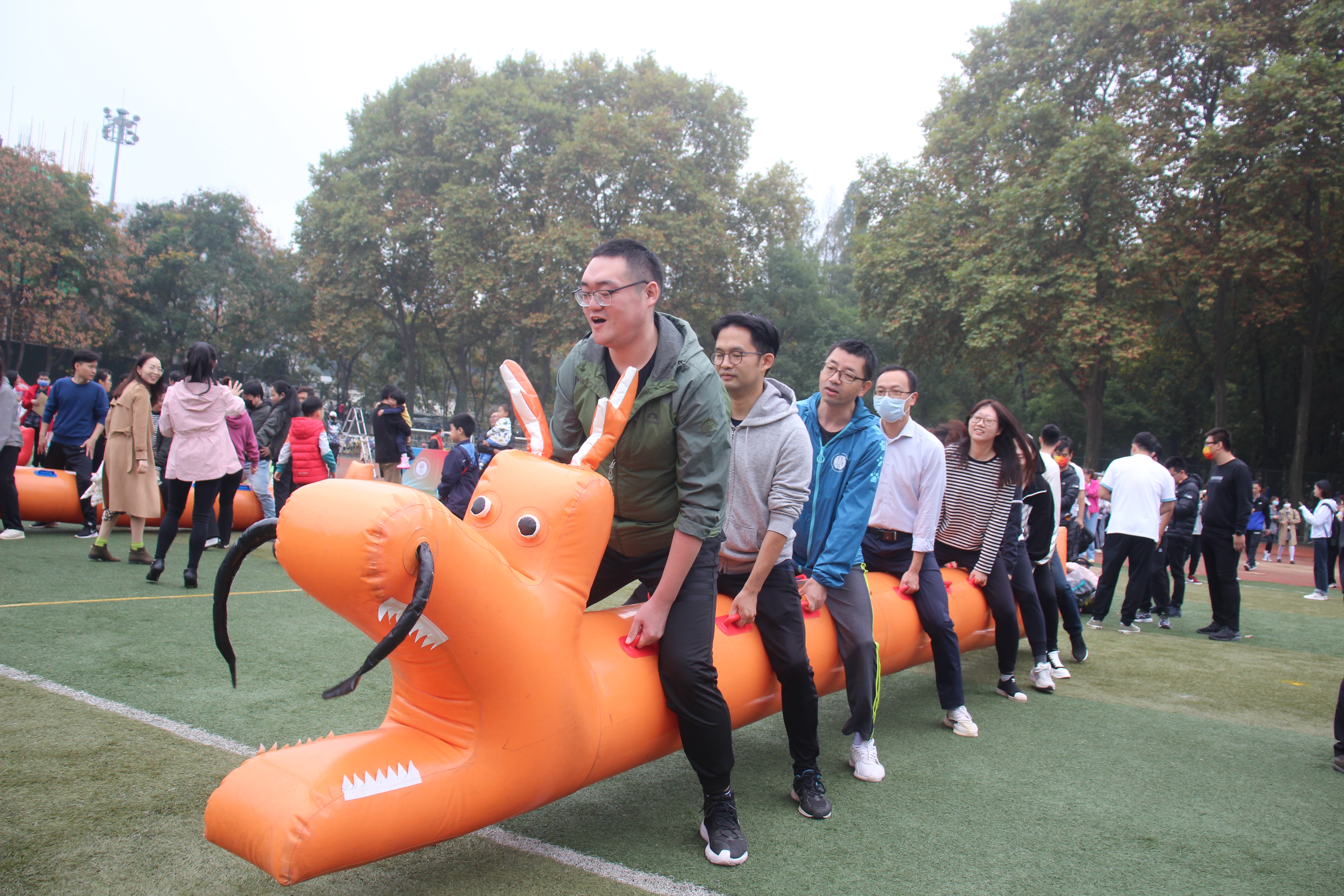开幕式后,陆地龙舟比赛在佑铭体育场南侧举行,参赛的外院教工早早集结,分析讨论竞赛技巧。比赛要求参赛者双脚撑地,双手抬起龙身并骑着充气龙舟跑向终点。50米赛道虽短,想要正确驾驭并快速冲向终点却不是件简单的事情,耐力、体力、智力、协调能力缺一不可,既是智力与体力的角逐,更是团队协作的完美比拼。