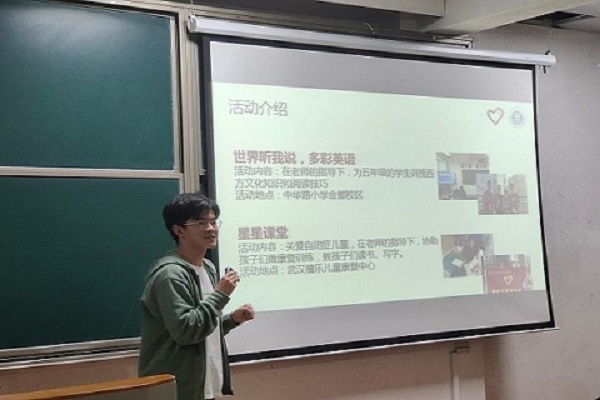 作为2020届外国语学院团委学生会青年志愿者协会主要负责人,谢嘉伟向在场外院新生介绍了由外院青志联举办的志愿活动,其中包括“世界听我说,多彩英语”、“晨光服务队外语辅导”、“四点半学校”等共八项活动,鼓励在场各位积极投身于外院的志愿服务中。