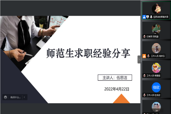 华大青年讯(通讯员 田祎涵)4月22日晚,外国语学院线上举办了师范生求职就业经验技巧分享会,本次活动由华中师范大学未来教育家联盟、教师教育学院主办,外国语学院学术科研部承办。分享会旨在响应国家关于高校毕业生实现更充分更高质量就业的号召,加强在校大学生对当前求职就业形势与前景的认识。外国语学院团委副书记牛静出席本次活动,2018级英语公费师范生伍思洁担任主讲人,外院主持队孙瑞青担任主持。