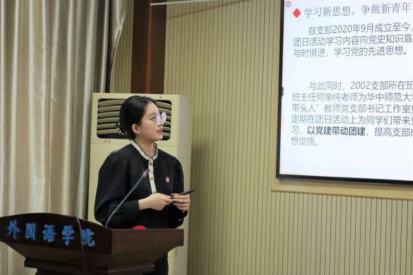 华大青年讯(通讯员 刘璇 陈雨)5月13日中午,外国语学院于3402教室举办了“百生讲坛”活力团支部评比活动。活动旨在落实习近平总书记关于青年工作的重要思想,增强基层团组织凝聚力,引导各支部持续深入地学习习近平新时代中国特色社会主义思想。活动邀请到外国语学院团委书记潘英子、团委副书记牛静、19级英语系辅导员邱领、21级小语种辅导员徐圆和2021年度红旗团支部1902支部团支书季可人担任评委。