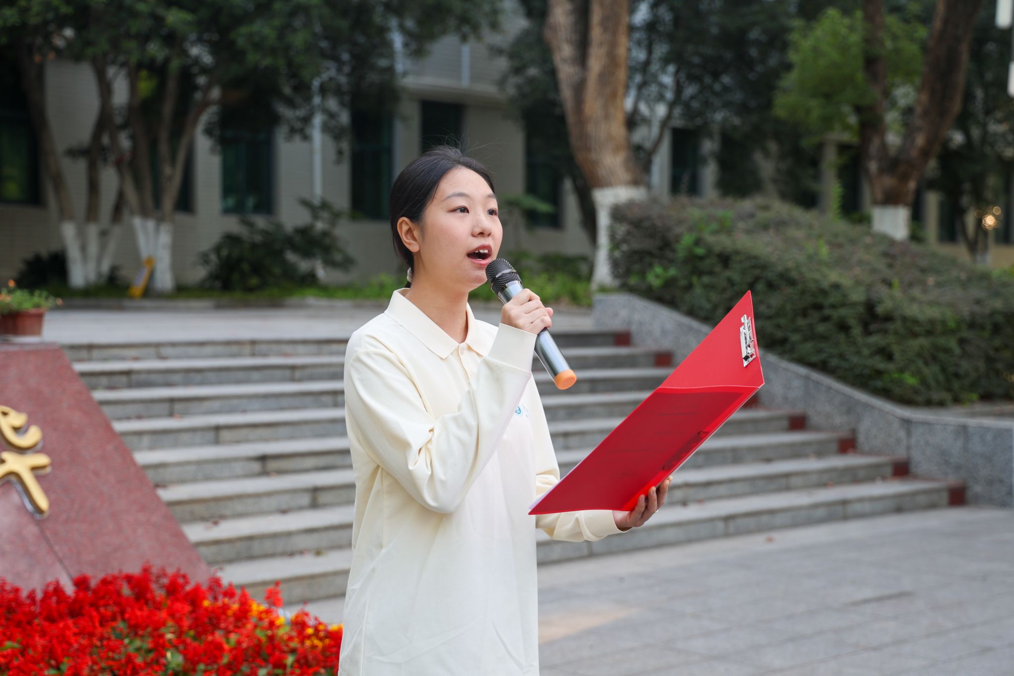外国语学院青年代表、校级红旗团支部英语2202团支部成员、校恽代英青年讲师团代表柳恩溪作国旗下演讲。她结合自身学习经历,号召同学们以青春之我建设青春之中国,展现了新时代青年学子的责任担当。随后,青年代表萨木哈尔、方艺涵等四位同学深情朗诵《美丽中国》。从塞北风光到江南烟雨,从历史长河到新时代画卷,抒发了对祖国的热爱之情。师生合唱《我和我的祖国》将仪式推向高潮,手持红旗的师生用歌声传递深情,在现场上汇聚成一片红色海洋。