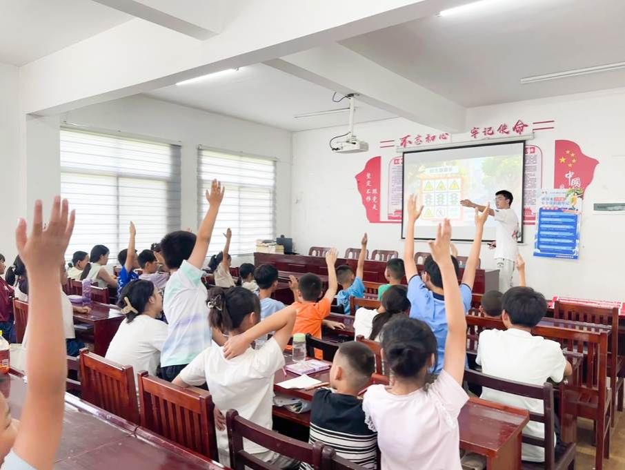 华大青年讯(通讯员 周应瑛 李辉煌 贾一翀 田杰聪 赖莉雅)为了强化学生的安全意识,为他们的暑期安全保驾护航,7月7日至9日,华中师范大学外国语学院心火支教团白霓队(以下简称“白霓队”)在白霓镇三溪村、大市村和洪泉村暑假学堂开展安全自护教育第一课。本次安全自护教育课涵盖防溺水、交通安全、禁毒、用电安全等内容,旨在通过生动的讲解和趣味活动,帮助学生了解安全注意事项,提升应急自救能力。