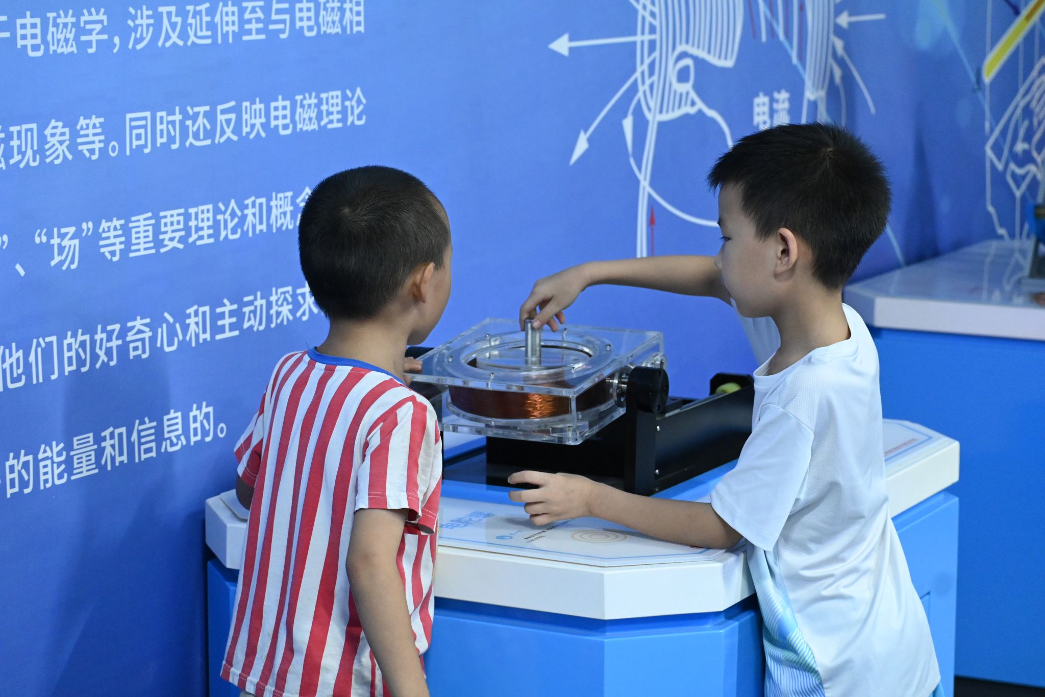 走进“光影世界”展厅,在经典与现代光学知识的结合中,孩子们在观察与体验的过程中感受物理规律与“光的艺术”。在讲解员的引导下,孩子们还走入了“机械韵律”“电磁世界”特色展厅,在特色情境中以实践探索与机械、电磁相关的运动规律,感受物理知识的神奇与美妙。
