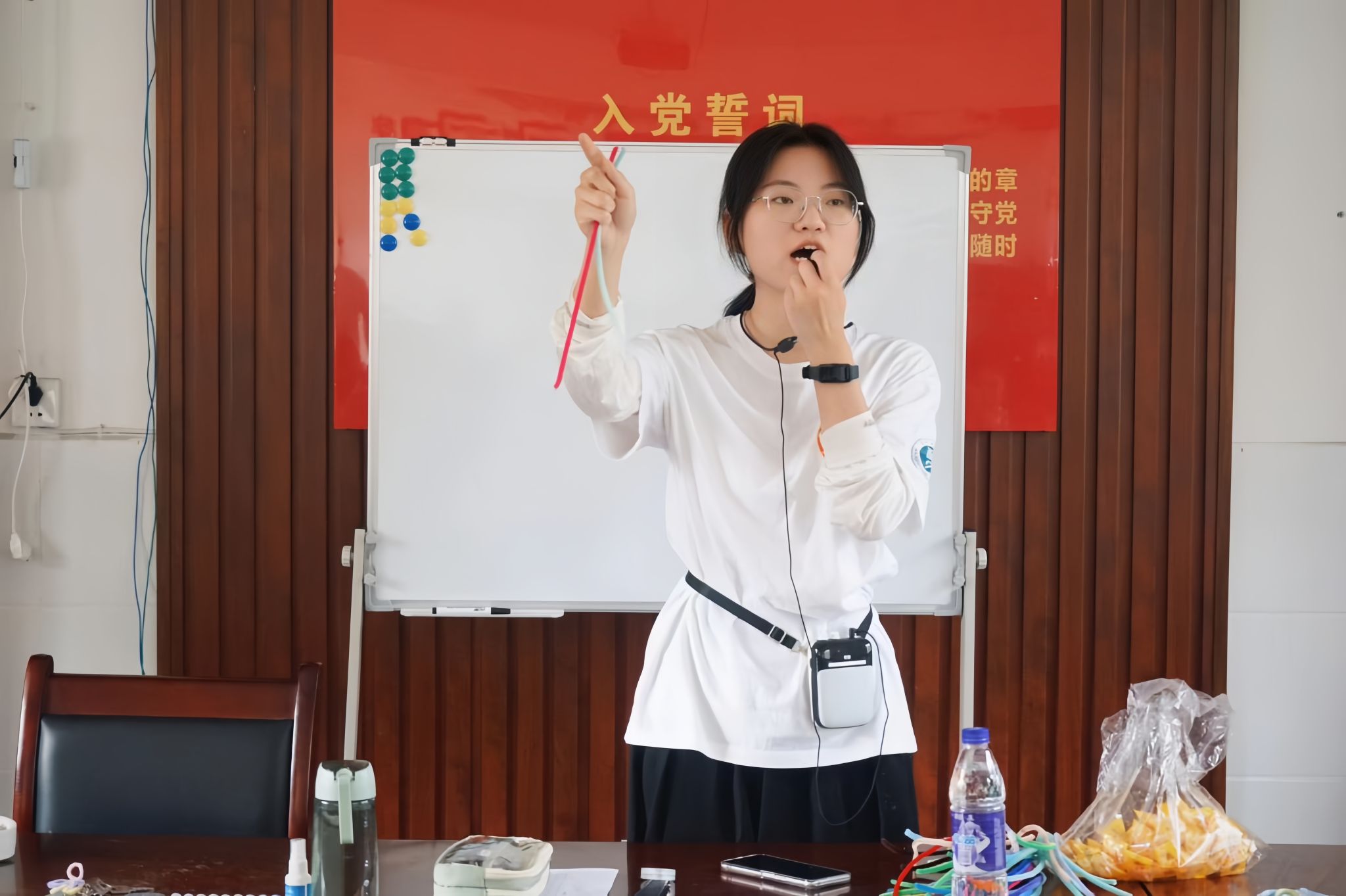 课程伊始,解勤勤向学生们分发扭扭棒,并详细介绍其材料特性、基本操作方法以及安全注意事项。随后,她以“眼镜框”和“蝴蝶戒指”两款作品为例,进行现场教学演示。从基础框架的搭建,到关键连接点的稳固处理,再到创意装饰的点缀,解勤勤逐步拆解制作过程,确保学生们能够理解。