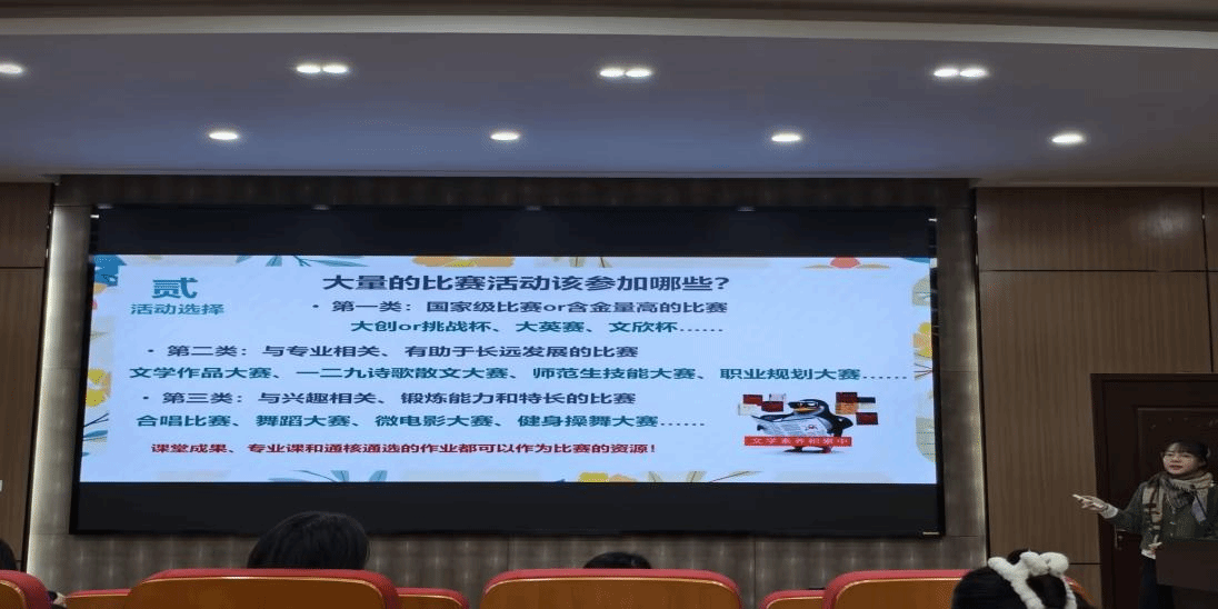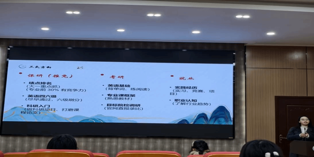 林诗洋从个人规划、信息获取、科研竞赛和实习实践四个方面分享。她解析了非师范生毕业后的三大发展路径,为大学四年核心任务和目标提供规划建议,列举信息获取渠道和检索方法,分享阅读文献心得。在科研竞赛方面,林诗洋介绍相关赛事并鼓励新生积极参与,并建议利用寒暑假争取机会,参与社会实践。