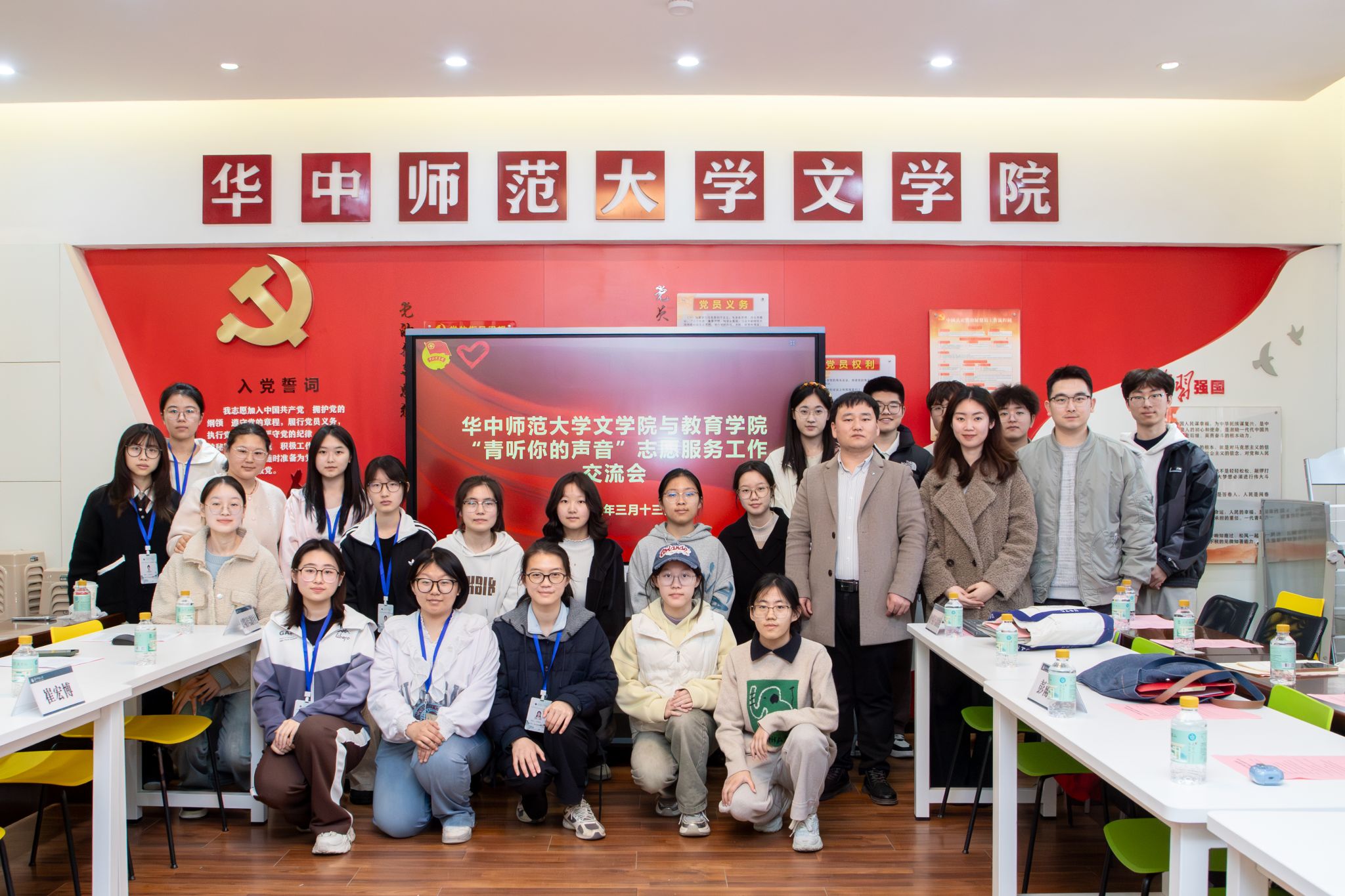 华大青年讯(通讯员 耿嘉彤 苏鑫雨 李雪琴 赵庆元)为深化志愿服务协同发展,搭建跨学院交流学习平台,3月13日下午,华中师范大学文学院青年志愿者协会(以下简称“文院青协”)与教育学院青年志愿者协会(以下简称“教院青协”)于文学院106党员活动室共同举办“青听你的声音”志愿服务工作交流会。文学院团委书记崔宏博、文学院团委副书记周旺章、教育学院团委副书记彭雨茜以及文院青协与教院青协全体成员参加本次会议。