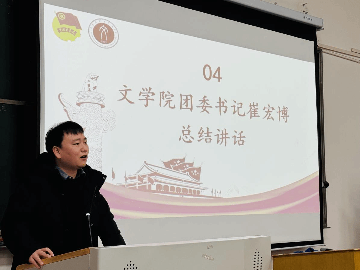 会议最后,崔宏博作总结发言。他肯定了各基层团支部前期在思想引领、组织建设等方面的成效,对下一阶段团务工作提出三点要求:一是强化理论武装,深学细悟党的创新理论,将学习成果转化为引领青年、服务大局的实际行动;二是强化纪律意识,引导团员青年积极参与团日活动,严守团的纪律,在组织生活中锤炼品格、增长才干;三是夯实基层基础,发挥团支部战斗堡垒作用,提升团组织引领力、组织力、服务力,带领文学院青年立足专业、脚踏实地,在奋斗实践中绽放青春光彩。