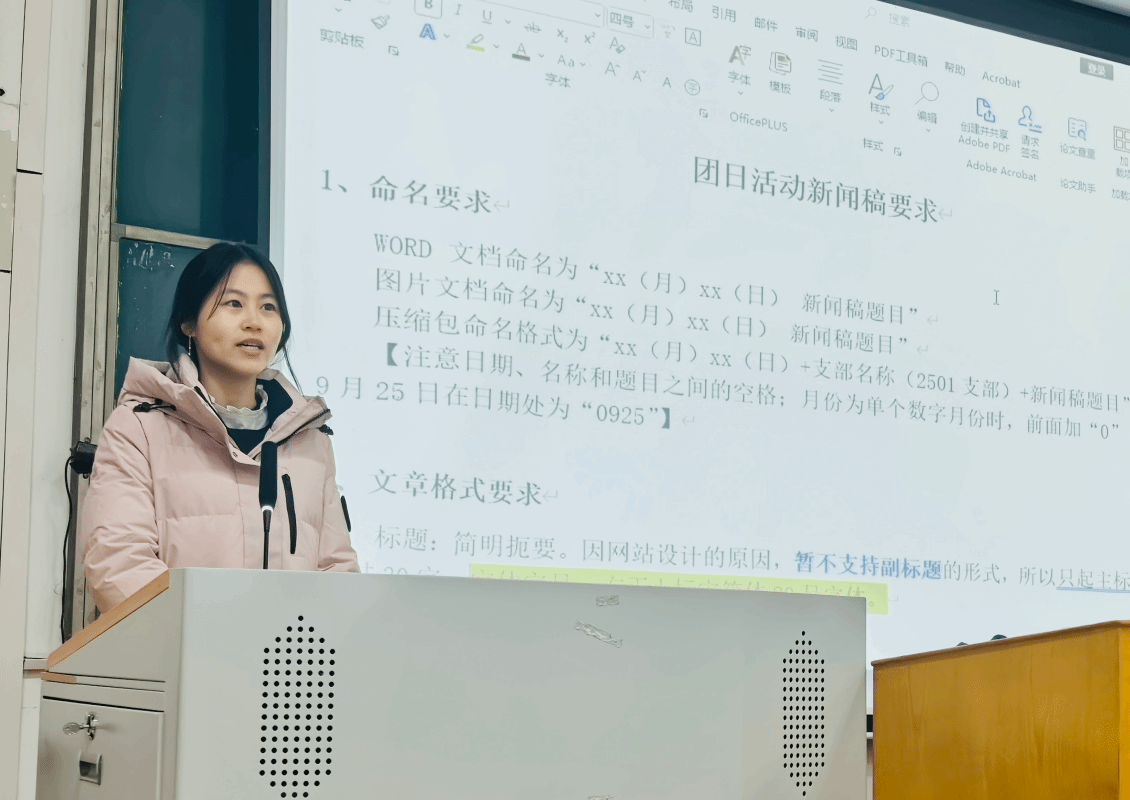 会议伊始,院团委组织部负责人白滢滢讲解团日活动相关工作,鼓励各支部依托学院学科优势,创新开展读书分享、文学志愿服务等主题团日活动。同时,她明确了本月团日活动的主题要求与材料提交规范,详细说明了宣传投稿格式,为各支部开展活动、做好宣传提供了清晰指导。