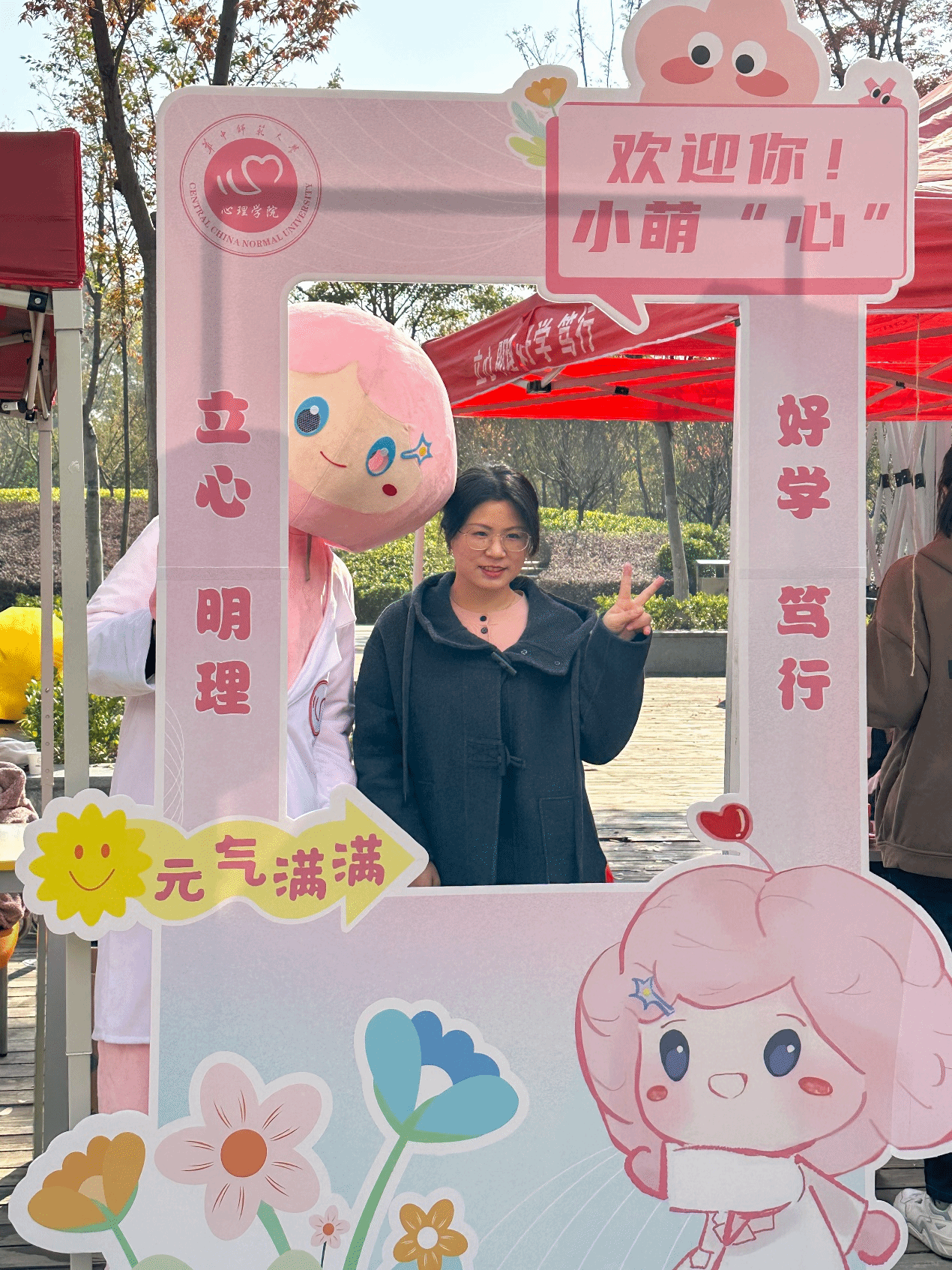 活动期间,心理学院吉祥物也全程 “在线”,憨态可掬的形象吸引了大批同学驻足合影,俏皮互动间为冬日校园增添了更多温馨与欢乐。