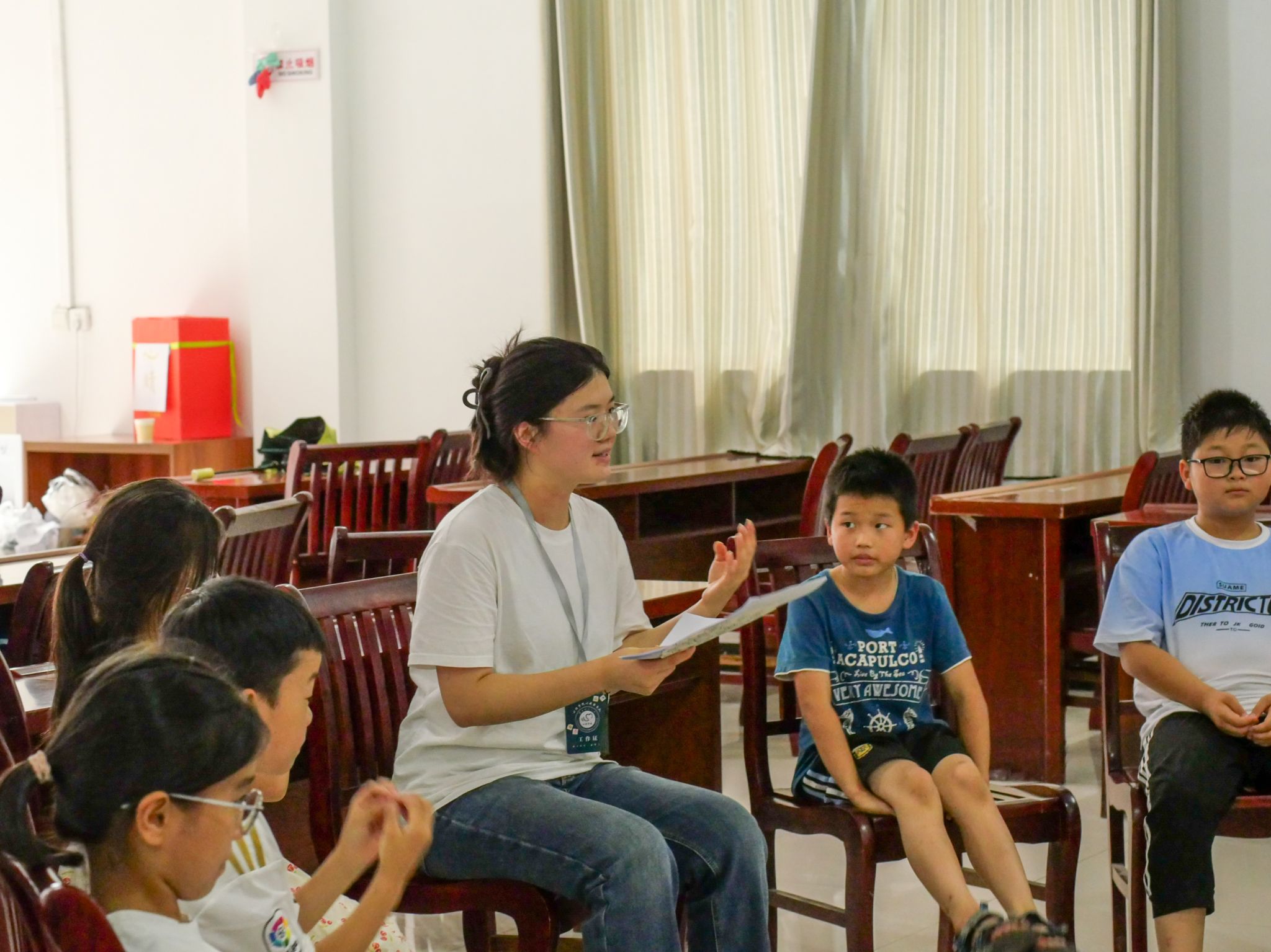 7月5日起,服务队每日为8至12岁的学生开设主题心理课程。课程内容涵盖网络防沉迷、情绪管理、生命教育、自我认知等,采用故事分享、情境模拟、小组讨论等多种互动方式,引导学生认识自我、接纳情绪、理解他人。一名学生表示,老师用他们熟悉的校园小事讲“情绪”,让他们发现原来生气时可以有这么多办法让自己平静下来。