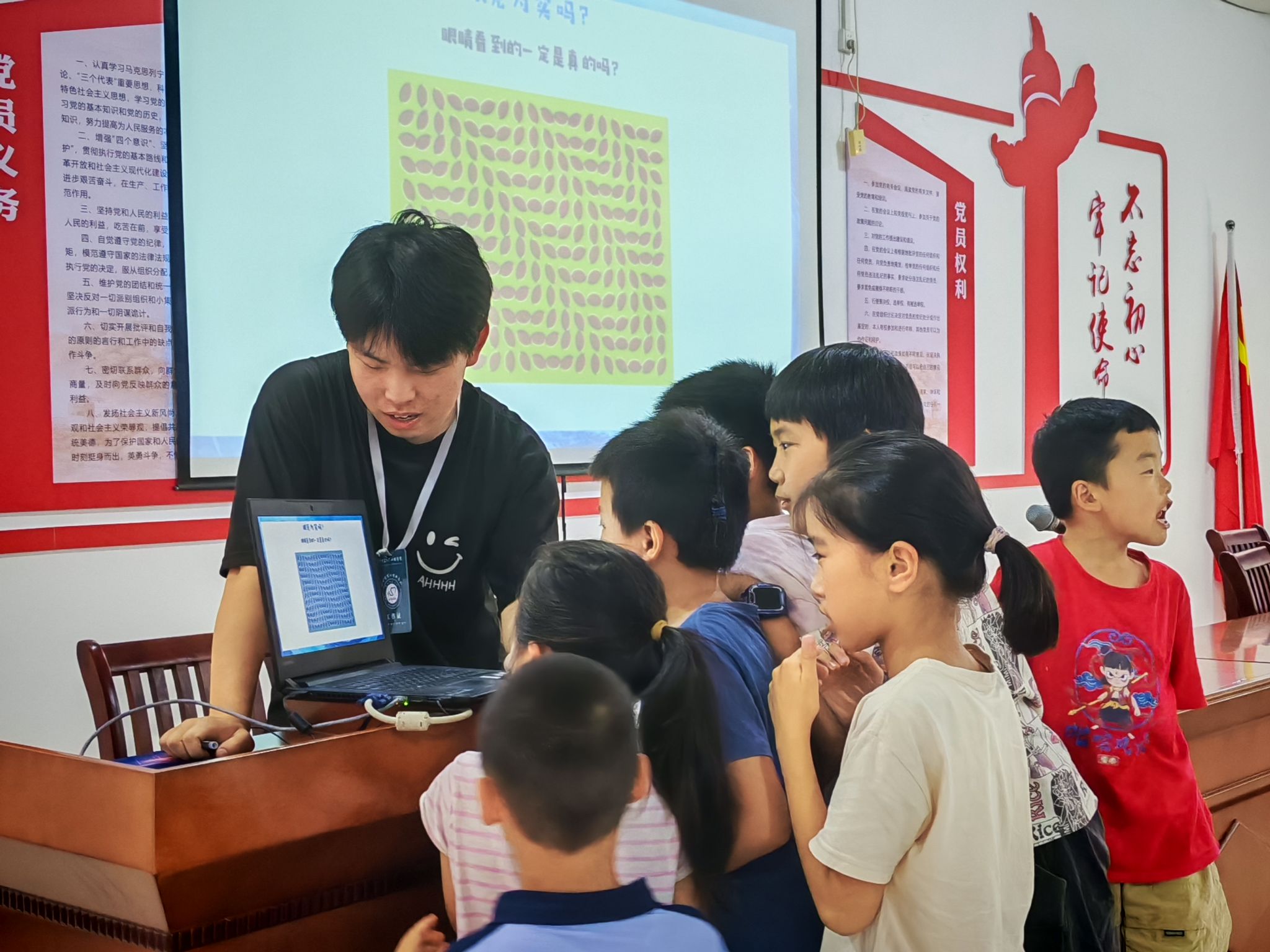 在心理课程与活动之外,心理科普环节也成为本次支教的亮点。7月6日与8日,NAO机器人心理互动体验将人工智能与心理教育相结合,服务队成员通过机器人展示舞蹈、趣味问答、实时对话等形式,结合大语言模型技术,向学生介绍心理调节小技巧。孩子们对能说能舞的机器人感到十分惊奇,称它们像“会聊天的老师”。7月6日与9日,心理科普课围绕“生活中的心理学”展开,服务队成员以广告创意、错觉图片、历史人物故事为切入点,用生动的案例讲解心理学原理,让学生在轻松氛围中理解心理知识,激发探索心理学的兴趣。