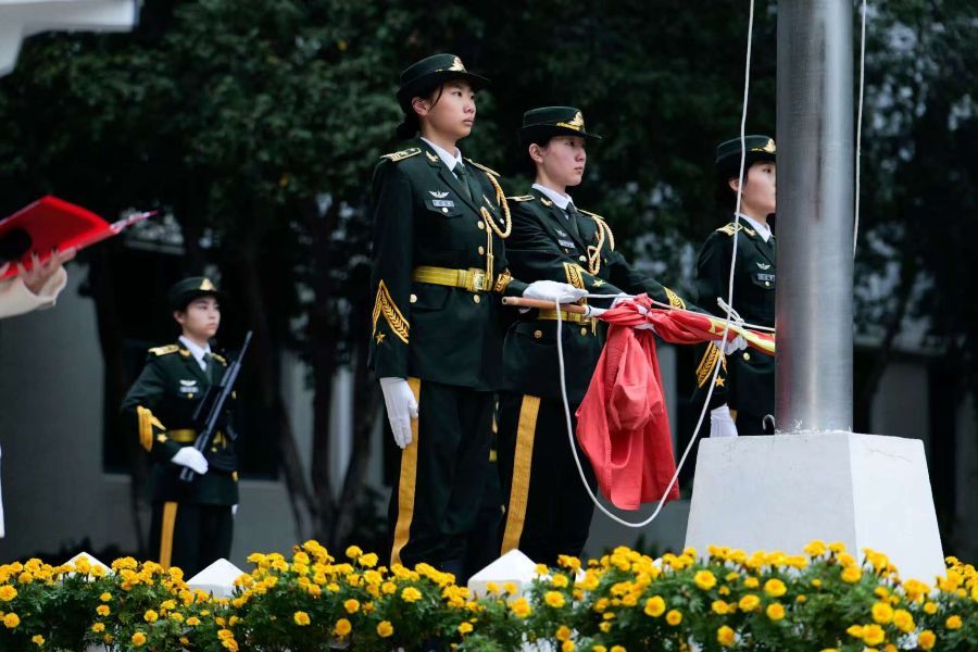 随后,激昂雄壮的《义勇军进行曲》奏响。五星红旗在晨光映照下缓缓升起,全体师生立正行注目礼,并跟唱国歌,直至国旗升至杆顶、迎风飘扬。