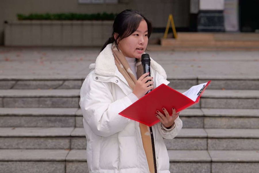 朗诵结束后,入党积极分子、大学生红心宣讲团成员、2024级本科生杜俏彤作为学生代表在国旗下发言。杜俏彤结合新闻先辈的事迹,分享了自身对新闻事业的认知与追求。她提到,新闻学子应以声传情、担当道义,坚守真实与公正的底线,以专业能力传递时代声音,以初心践行媒体人的社会责任,争做红旗精神的传承者与中国故事的传播者。