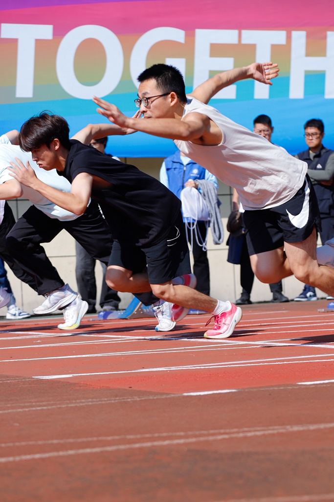 而在男子100米的起跑线上,参赛同学如同猎豹般紧绷身体,脚尖轻点地面,双眼紧盯着终点线,蓄势待发。随着发令枪“砰”的一声巨响,整个赛场仿佛被点燃,空气中弥漫着紧张又兴奋的气息。参赛同学双腿猛地发力,如同离弦之箭,在枪声落下的同时冲出了起跑线。跑道两侧上爆发出加油呐喊声,不断为运动健儿打气。