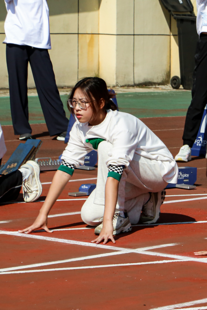 虽然心中紧张,但面对比赛,王雨彤丝毫没有松懈。依照裁判的口令,她迅速调整到起跑姿势,看向终点线,目光坚定。一声枪响,王雨彤立马从起跑线弹出,迈开步子,以最快速度全力冲刺。后半程,她紧咬前面的选手,顺利冲过终点线。