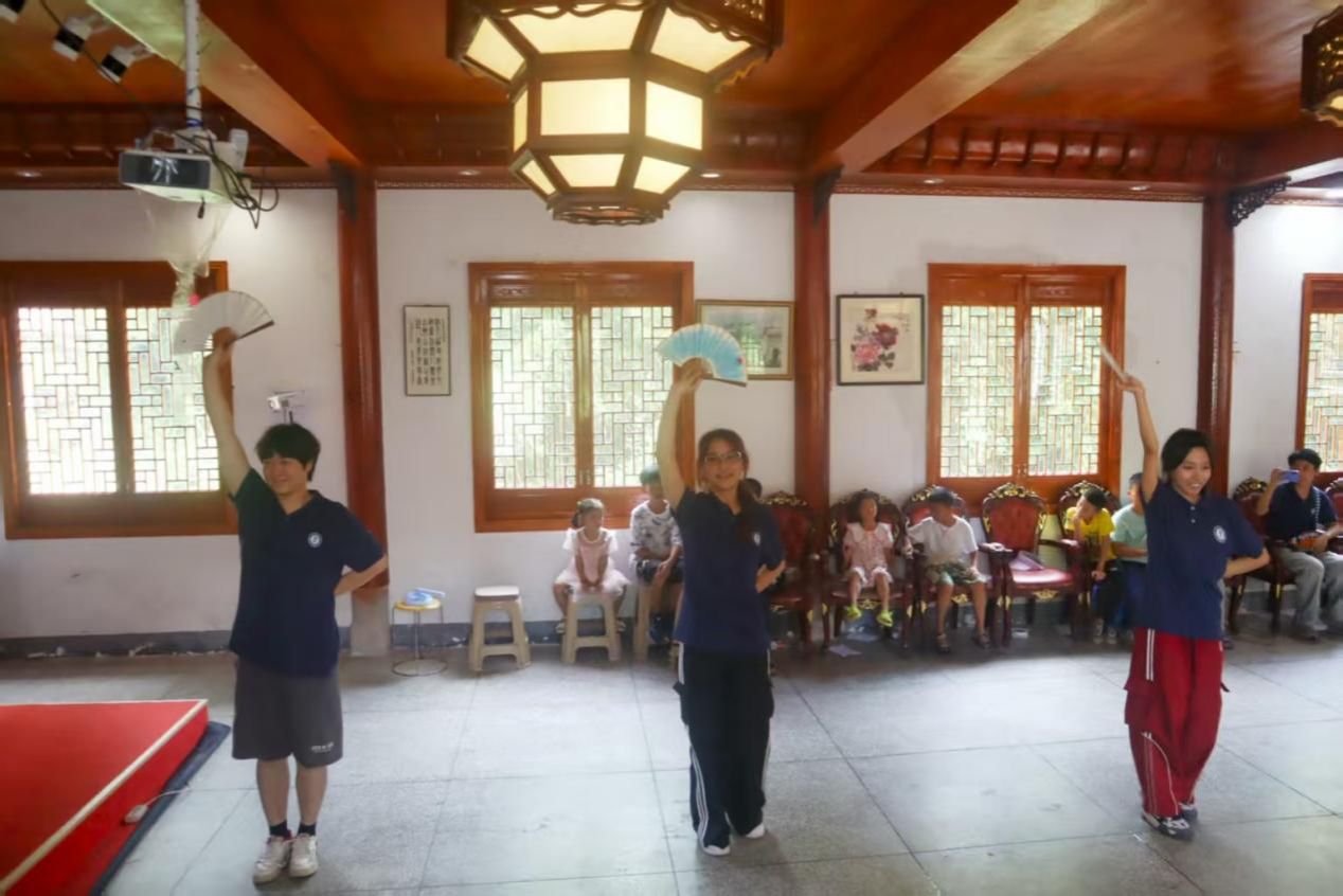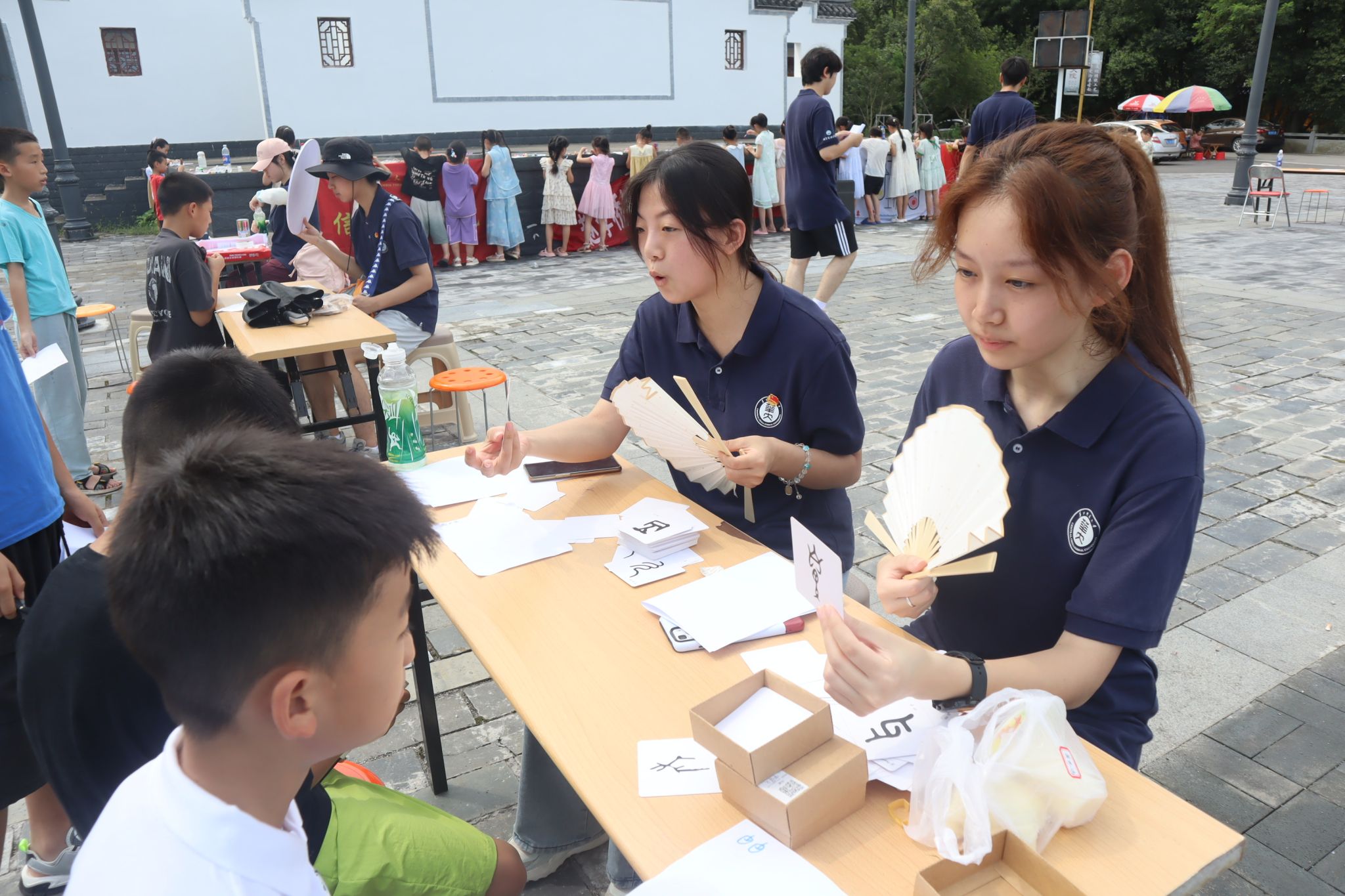 追光实践队联合可鸣思政工作室举办传统文化游园会成为乡村夏日里的欢乐盛宴。游园会共设置10个体验摊位,带来丰富互动。团扇绘制区,孩子们在素白扇面彩绘;折扇创作区,笔墨书香浸润扇面;剪纸摊位上,孩子们通过对折、剪弧等步骤创作传统纹样;还有知识问答、踢毽子等多元挑战。百余名儿童与家长参与“非遗闯关”,集章兑换奖品,在欢笑声中沉浸式感受传统文化魅力,增进彼此情谊。