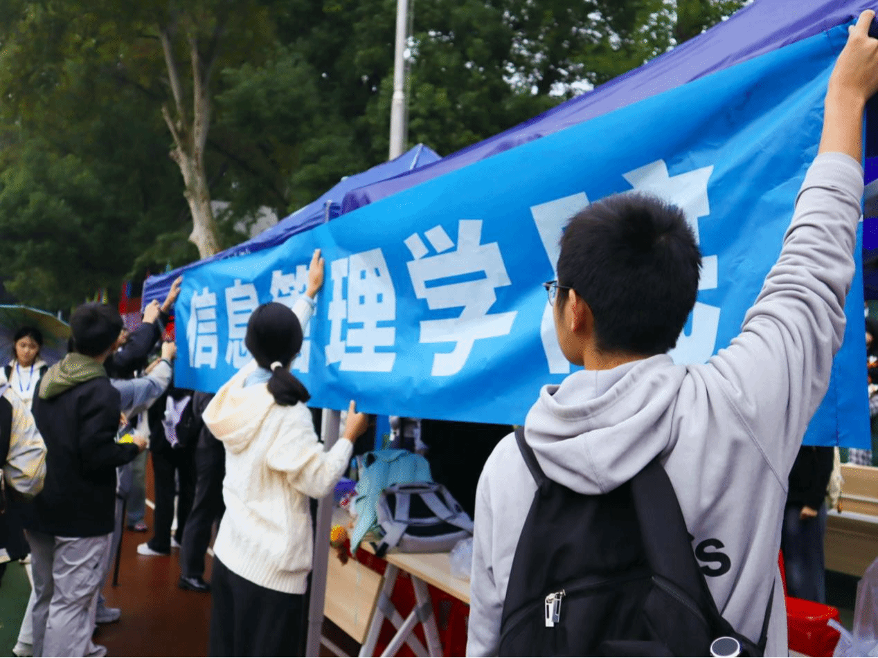 清晨,信管志愿者带着物资抵达赛场,搭建印有“信息管理学院”的蓝色帐篷,搬运装满矿泉水、加油棒的补给箱,调试学院的音响。志愿者们还特意将学院特色旗帜插在大本营旁。随风飘扬的旗帜,不仅是学院的象征,更是运动员们一眼就能找到的坐标。
