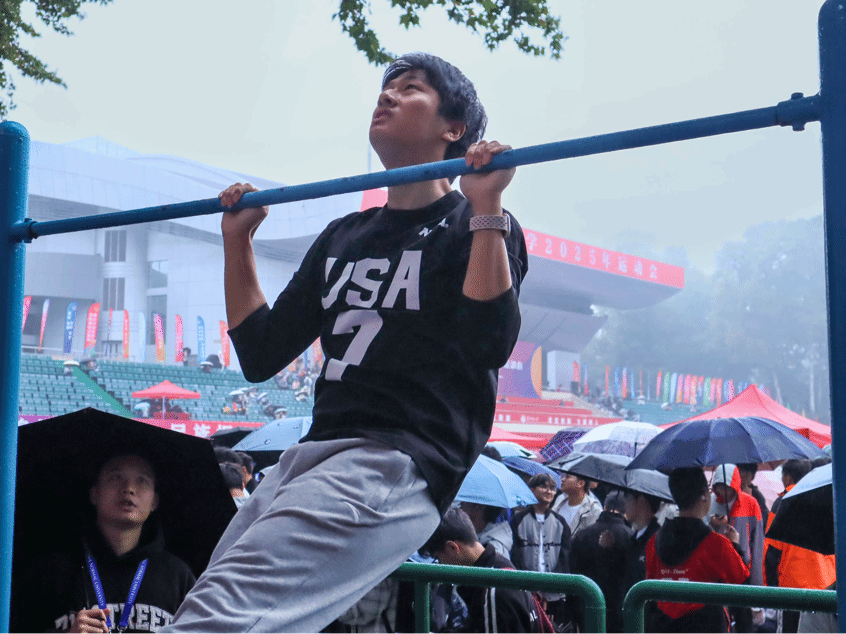 单杠赛场见证着力量的较量,信管选手握杠悬垂,肩背发力,身体在空中划出弧线。这一刻,青春定格在那即使不停发颤也仍旧紧握单杠的双手。每一次下颌过杠,都是对身体极限的勇敢突破;每一次肌肉的颤抖与坚持,都是对意志的反复淬炼。他们用坚实的臂膀扛起挑战,用滴落的汗水诠释着“文明其精神,野蛮其体魄”的深刻内涵,更将信管学子不服输、不放弃的青春姿态,定格在运动会的赛场上。