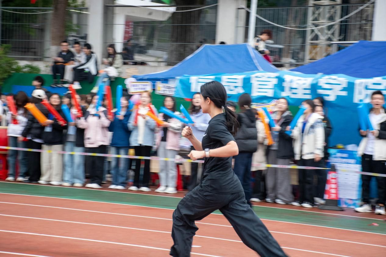 赛场一侧,信管学院的志愿者们始终聚集在看台区域,以整齐有力的节奏高声呐喊,为赵海岩注入源源不断的精神动力。他们不仅是比赛的见证者,更是选手身后最温暖的支撑,展现出信管人团结一心、众志成城的集体风貌。